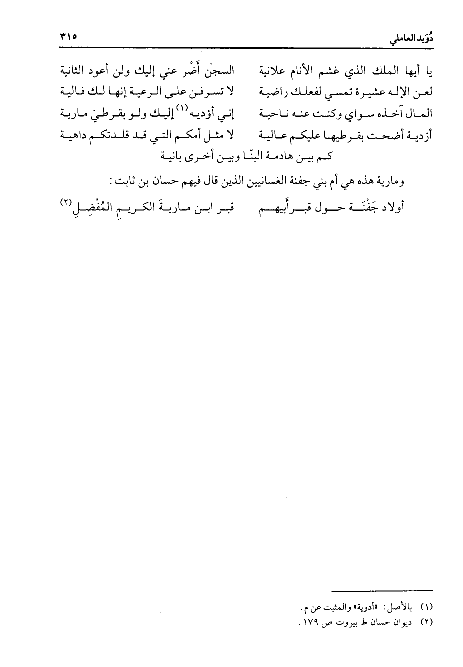 يا أيها الملك الذي غشم الأنام علانية * السجن أضر عني إليك ولن أعود الثانية لعن الإله عشيرة تمسي لفعلك راضية * لا تسرفن على الرعية إنها لك فالية المال آخذه سواي وكنت عنه ناحية * إني أؤديه (1) إليك ولو بقرطي مارية أزدية أضحت بقرطيها عليكم عالية * لا مثل أمكم التي قد قلدتكم داهية كم بين هادمة البنا وبين أخرى بانية ومارية هذه هي أم بني جفنة الغسانيين الذين قال فيهم حسان بن ثابت * أولاد جفنة حول قبر أبيهم * قبر ابن مارية الكريم المفضل (2)