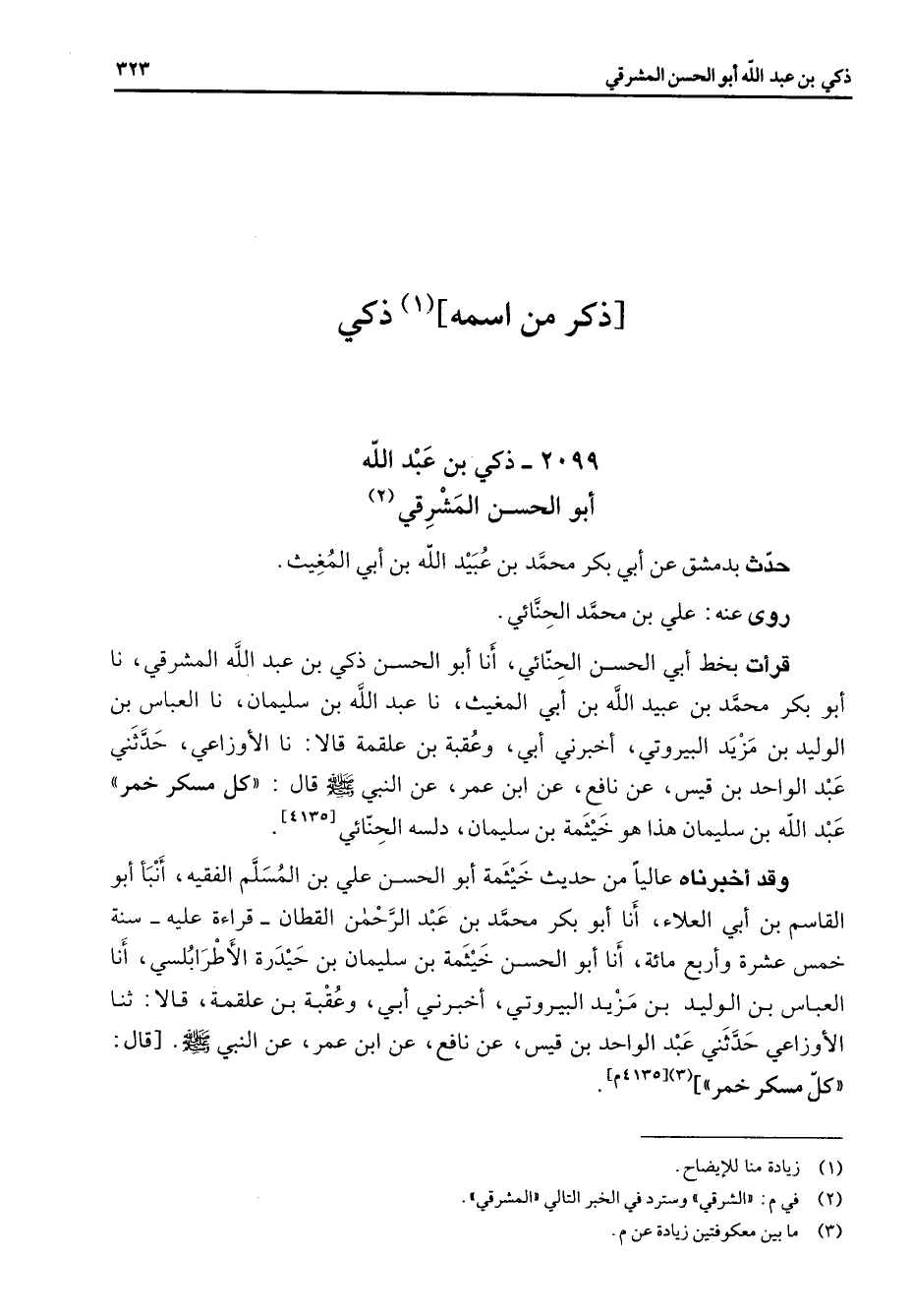 2099 - ذكي بن عبد الله أبو الحسن المشرقي (2) حدث بدمشق عن أبي بكر محمد بن عبيد الله بن أبي المغيث روى عنه علي بن محمد الحنائي قرأت بخط أبي الحسن الحنائي أنا أبو الحسن ذكي بن عبد الله المشرقي نا أبو بكر محمد بن عبيد الله بن أبي المغيث نا عبد الله بن سليمان نا العباس بن الوليد بن مزيد البيروتي أخبرني أبي وعقبة بن علقمة قالا نا الأوزاعي حدثني عبد الواحد بن قيس عن نافع عن ابن عمر عن النبي (صلى الله عليه وسلم) قال كل مسكر خمر عبد الله بن سليمان هذا هو خيثمة بن سليمان دلسه الحنائي وقد أخبرناه عاليا من حديث خيثمة أبو الحسن علي بن المسلم الفقيه أنبأ أبو القاسم بن أبي العلاء أنا أبو بكر محمد بن عبد الرحمن القطان قراءة عليه سنة خمس عشرة وأربع مائة أنا أبو الحسن خيثمة بن سليمان بن حيدرة الأطرابلسي أنا العباس بن الوليد بن مزيد البيروتي أخبرني أبي وعقبة بن علقمة قالا ثنا الأوزاعي حدثني عبد الواحد بن قيس عن نافع عن ابن عمر عن النبي (صلى الله عليه وسلم) قال كل مسكر خمر