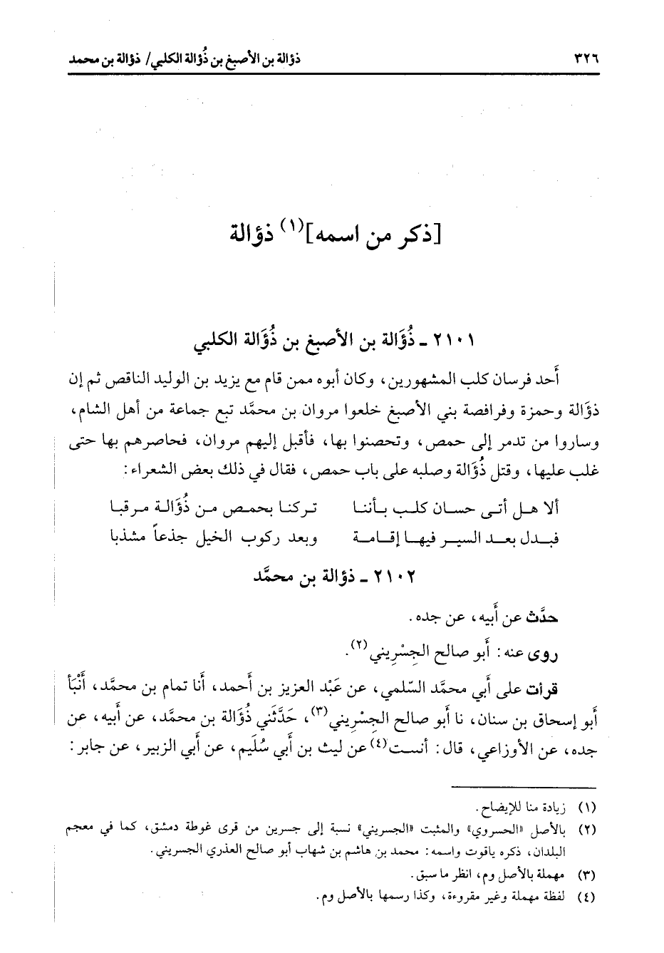 2101 - ذؤالة بن الأصبغ بن ذؤالة الكلبي أحد فرسان كلب المشهورين وكان أبوه ممن قام مع يزيد بن الوليد الناقص ثم إن ذؤالة وحمزة وفرافصة بني الأصبغ خلعوا مروان بن محمد تبع جماعة من أهل الشام وساروا من تدمر إلى حمص وتحصنوا بها فأقبل إليهم مروان فحاصرهم بها حتى غلب عليها وقتل ذؤالة وصلبه على باب حمص فقال في ذلك بعض الشعراء * ألا هل أتى حسان كلب بأننا * تركنا بحمص من ذؤالة مرقبا فبدل بعد السير فيها إقامة * وبعد ركوب الخيل جذعا مشذبا *