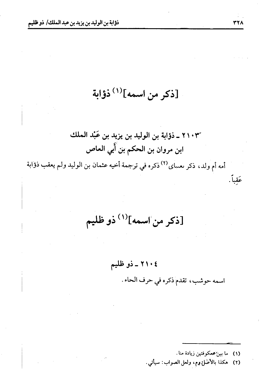 2103 - ذؤابة بن الوليد بن يزيد بن عبد الملك ابن مروان بن الحكم بن أبي العاص أمه أم ولد ذكر نعساى (2) ذكره في ترجمة أخيه عثمان بن الوليد ولم يعقب ذؤابة عقبا