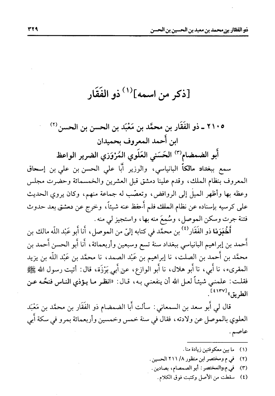 2105 - ذو الفقار بن محمد بن معبد بن الحسن بن الحسن (2) ابن أحمد المعروف بحميدان أبو الضمضام (3) الحسني العلوي المروزي الضرير الواعظ سمع ببغداد مالكا البانياسي والوزير أبا علي الحسن بن علي بن إسحاق المعروف بنظام الملك وقدم علينا دمشق قبل العشرين والخمسائة وحضرت مجلس وعظه بها وأظهر الميل إلى الروافض وتعصب له جماعة منهم وكان يروي الحديث على كرسيه بإسناده عن نظام الملك فلم أحفظ عنه شيئا وخرج عن دمشق بعد حدوث فتنة جرت وسكن الموصل وسمع منه بها واستجيز لي منه أخبرنا ذو الفقار (4) بن محمد في كتابه إلى من الموصل أنا أبو عبد الله مالك بن أحمد بن إبراهيم البانياسي ببغداد سنة تسع وسبعين وأربعمائة أنا أبو الحسن أحمد بن محمد بن أحمد بن الصلت نا إبراهيم بن عبد الصمد نا محمد بن عبد الله بن يزيد المقرئ نا أبي نا أبو هلال نا أبو الوازع عن أبي برزة قال أتيت رسول الله (صلى الله عليه وسلم) فقلت علمني شيئا لعل الله أن ينفعني به قال انظر ما يؤذي الناس فنحه عن الطريق قال لي أبو سعد بن السمعاني سألت أبا الضمضام ذو الفقار بن محمد بن معبد العلوي بالموصل عن ولادته فقال في سنة خمس وخمسين وأربعمائة بمرو في سكة أبي عاصم "