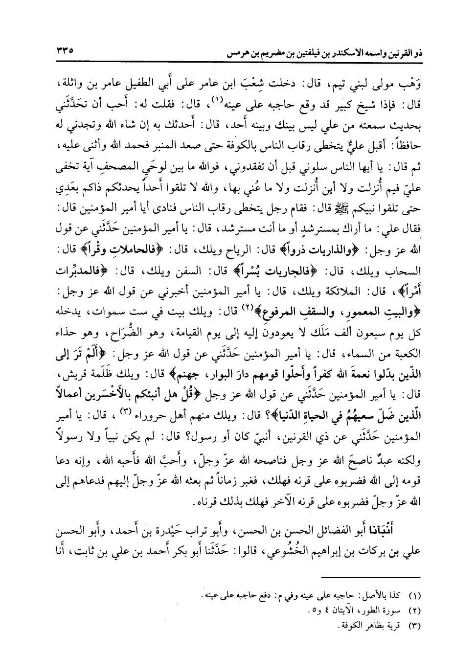 وهب مولى لبني تيم قال دخلت شعب ابن عامر على أبي الطفيل عامر بن واثلة قال فإذا شيخ كبير قد وقع حاجبه على عينه (1) قال فقلت له أحب أن تحدثني بحديث سمعته من علي ليس بينك وبينه أحد قال أحدثك به إن شاء الله وتجدني له حافظا أقبل علي يتخطى رقاب الناس بالكوفة حتى صعد المنبر فحمد الله وأثنى عليه ثم قال يا أيها الناس سلوني قبل أن تفقدوني فوالله ما بين لوحي المصحف آية تخفى علي فيم أنزلت ولا أين أنزلت ولا ما عني بها والله لا تلقوا أحدا يحدثكم ذاكم بعدي حتى تلقوا نبيكم (صلى الله عليه وسلم) قال فقام رجل يتخطى رقاب الناس فنادى أيا أمير المؤمنين قال فقال علي ما أراك بمسترشد أو ما أنت مسترشد قال يا أمير المؤمنين حدثني عن قول الله عز وجل " والذاريات ذروا " قال الرياح ويلك قال " فالحاملات وقرا " قال السحاب ويلك قال " فالجاريات يسرا " قال السفن ويلك قال " فالمدبرات أمرا " قال الملائكة ويلك قال يا أمير المؤمنين أخبرني عن قول الله عز وجل " والبيت المعمور والسقف المرفوع " (2) قال ويلك بيت في ست سماوات يدخله كل يوم سبعون ألف ملك لا يعودون إليه إلى يوم القيامة وهو الضراح وهو حذاء الكعبة من السماء قال يا أمير المؤمنين حدثني عن قول الله عز وجل " ألم تر إلى الذين بدلوا نعمة الله كفرا وأحلوا قومهم دار البوار جهنم " قال ويلك ظلمة قريش قال يا أمير المؤمنين حدثني عن قول الله عز وجل " قل هل أنبئكم بالأخسرين أعمالا الذين ضل سعيهم في الحياة الدنيا " قال ويلك منهم أهل حروراء (3) قال يا أمير المؤمنين حدثني عن ذي القرنين أنبي كان أو رسول قال لم يكن نبيا ولا رسولا ولكنه عبد ناصح الله عز وجل فناصحه الله عز وجل وأحب الله فأحبه الله وإنه دعا قومه إلى الله فضربوه على قرنه فهلك فغبر زمانا ثم بعثه الله عز وجل إليهم فدعاه إلى الله عز وجل فضربوه على قرنه الآخر فهلك بذلك قرناه أنبأنا أبو الفضل الحسن بن الحسن وأبو تراب حيدرة بن أحمد وأبو الحسن علي بن بركات بن إبراهيم الخشوعي قالوا حدثنا أبو بكر أحمد بن علي بن ثابت أنا