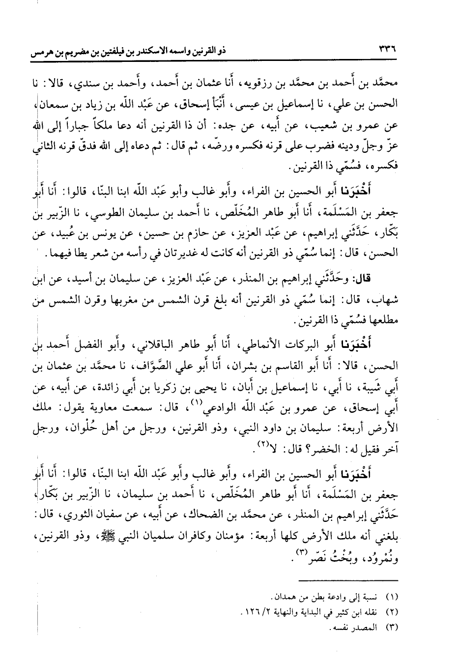 محمد بن أحمد بن محمد بن رزقويه أنا عثمان بن أحمد وأحمد بن سندي قالا نا الحسن بن علي نا إسماعيل بن عيسى أنبأ إسحاق عن عبد الله بن زياد بن سمعان عن عمرو بن شعيب عن أبيه عن جده أن ذا القرنين أنه دعا ملكا جبارا إلى الله عز وجل ودينه فضرب على قرنه فكسره ورضه ثم قال ثم دعاه إلى الله فدق قرنه الثاني فكسره فسمي ذا القرنين أخبرنا أبو الحسين بن الفراء وأبو غالب وأبو عبد الله ابنا البنا قالوا أنا أبو جعفر بن المسلمة أنا أبو طاهر المخلص نا أحمد بن سليمان الطوسي نا الزبير بن بكار حدثني إبراهيم عن عبد العزيز عن حازم بن حسين عن يونس بن عبيد عن الحسن قال إنما سمي ذو القرنين أنه كانت له غديرتان في رأسه من شعر يطا فيهما قال وحدثني إبراهيم بن المنذر عن عبد العزيز عن سليمان بن أسيد عن ابن شهاب قال إنما سمي ذو القرنين أنه بلغ قرن الشمس من مغربها وقرن الشمس من مطلعها فسمي ذا القرنين أخبرنا أبو البركات الأنماطي أنا أبو طاهر الباقلاني وأبو الفضل أحمد بن الحسن قالا أنا أبو القاسم بن بشران أنا أبو علي الصواف نا محمد بن عثمان بن أبي شيبة نا أبي نا إسماعيل بن أبان نا يحيى بن زكريا بن أبي زائدة عن أبيه عن أبي إسحاق عن عمرو بن عبد الله الوادعي (1) قال سمعت معاوية يقول ملك الأرض أربعة سليمان بن داود النبي وذو القرنين ورجل من أهل حلوان ورجل آخر فقيل له الخضر قال لا (2) أخبرنا أبو الحسين بن الفراء وأبو غالب وأبو عبد الله ابنا البنا قالوا أنا أبو جعفر بن المسلمة أنا أبو طاهر المخلص نا أحمد بن سليمان نا الزبير بن بكار حدثني إبراهيم بن المنذر عن محمد بن الضحاك عن أبيه عن سفيان الثوري قال بلغني أنه ملك الأرض كلها أربعة مؤمنان وكافران سليمان النبي (صلى الله عليه وسلم) وذو القرنين ونمرود وبخت نصر (3)