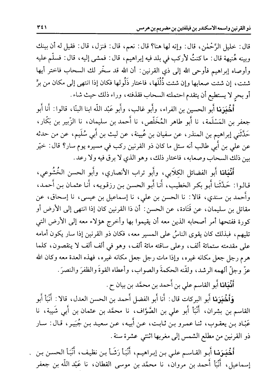 قال خليل الرحمن قال وإنه لهاهنا قال نعم قال فنزل قال فقيل له أن بينك وبينه هنيهة قال ما كنت لأركب في بلد فيه إبراهيم قال فمشى إليه قال فسلم عليه وأوصاه إبراهيم فأوحى الله إلى ذي القرنين أن الله قد سخر لك السحاب فاختر أيها شئت إن شئت صعابها وإن شئت ذللها فاختار ذلولها فكان إذا انتهى إلى مكان من بر أو بحر لا يستطيع أن يتقدم احتملته السحاب فقذفته وراء ذلك حيث شاء أخبرنا أبو الحسين بن الفراء وأبو غالب وأبو عبد الله ابنا البنا قالوا أنا أبو جعفر بن المسلمة نا أبو طاهر المخلص نا أحمد بن سليمان نا الزبير بن بكار حدثني إبراهيم بن المنذر عن سفيان بن عيينة عن ليث بن أبي سليم عن من حدثه عن علي بن أبي طالب أنه سئل ما كان ذو القرنين ركب في مسيرة يوم سار قال خير بين ذلك السحاب وصعابه فاختار ذلك وهو الذي لا برق فيه ولا رعد أنبأنا أبو الفضائل الكلابي وأبو تراب الأنصاري وأبو الحسن الخشوعي قالوا حدثنا أبو بكر الخطيب أنا أبو الحسن بن رزقويه أنا عثمان بن أحمد وأحمد بن سندي قالا نا الحسن بن علي نا إسماعيل بن عيسى نا إسحاق عن مقاتل بن سليمان عن قتادة عن الحسن أن ذا القرنين كان إذا انتهى إلى الأرض أو كورة ففتحها أمر أصحابه الذين معه أن يقيموا بها وأخرج هؤلاء معه إلى الأرض التي تليهم فبذلك كان يقوى الناس على المسير معه فكان ذو القرنين إذا سار يكون أمامه على مقدمته ستمائة ألف وعلى ساقته مائة ألف وهو في ألف ألف لا ينقصون كلما هرم رجل جعل مكانه غيره وإذا مات رجل جعل مكانه غيره فهذه العدة معه وكان الله عز وجل ألهمه الرشد ولقنه الحكمة والصواب وأعطاه القوة والظفر والنصر أنبأنا أبو القاسم علي بن أحمد بن محمد بن بيان وأخبرنا أبو البركات قال أنا أبو الفضل أحمد بن الحسن العدل قالا أنبأ أبو القاسم بن بشران أنبأ أبو علي بن الصواف نا محمد بن عثمان بن أبي شيبة نا عباد بن يعقوب ثنا عمرو بن ثابت عن أبيه عن سعيد بن جبير قال سار ذو القرنين من مطلع الشمس إلى مغربها اثنتي عشرة سنة أخبرنا أبو القاسم علي بن إبراهيم أنبأ رشأ بن نظيف أنبأ الحسن بن إسماعيل أنبأ أحمد بن مروان نا محمد بن موسى القطان نا عبد الله بن جعفر