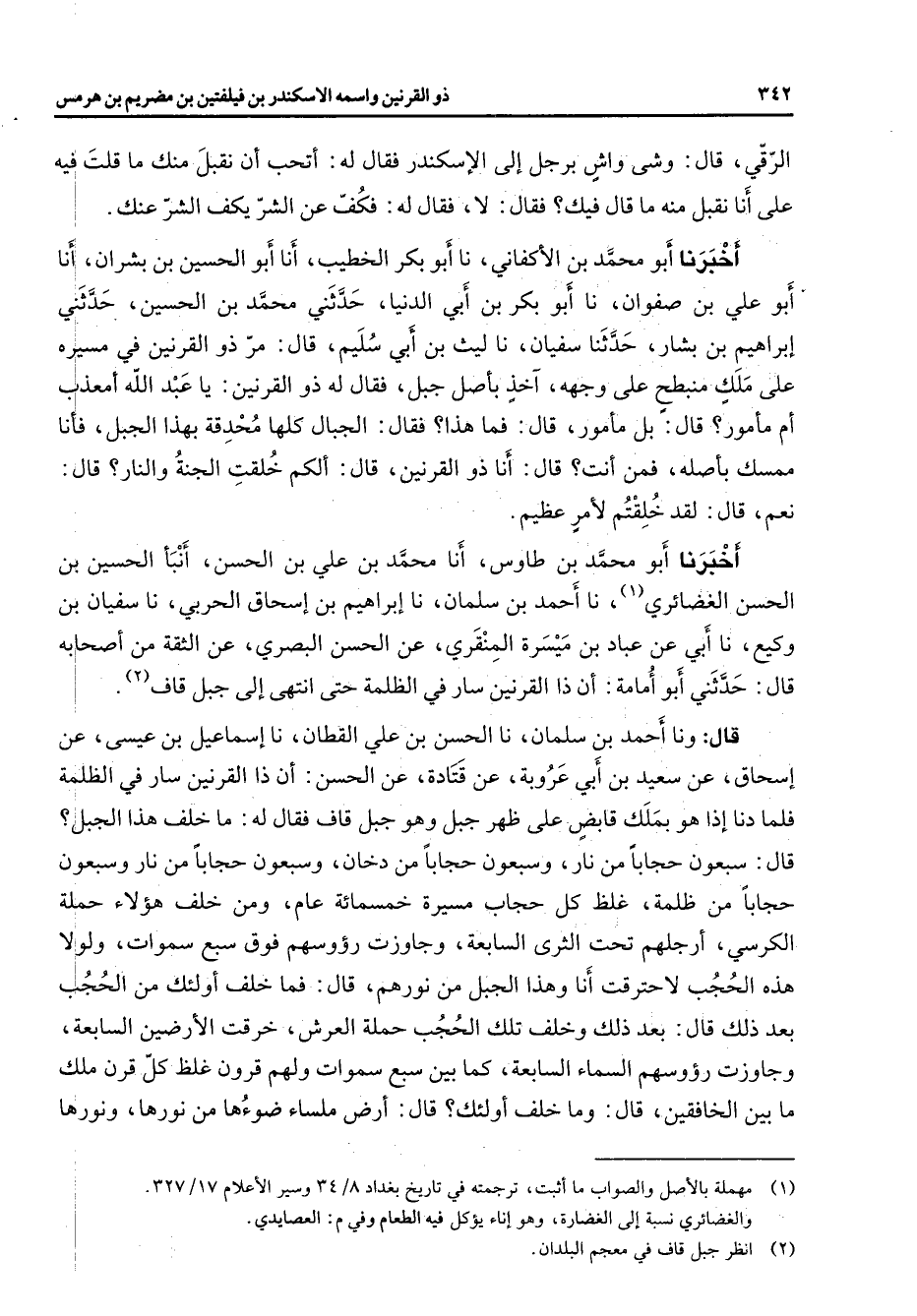 الرقي قال وشى واش برجل إلى الاسكندر فقال له أتحب أن نقبل منك ما قلت فيه على أنا نقبل منه ما قال فيك فقال لا فقال له فكف عن الشر يكف الشر عنك أخبرنا أبو محمد بن الأكفاني نا أبو بكر الخطيب أنا أبو الحسين بن بشران أنا أبو علي بن صفوان نا أبو بكر بن أبي الدنيا حدثني محمد بن الحسين حدثني إبراهيم بن بشار حدثنا سفيان نا ليث بن أبي سليم قال مر ذو القرنين في مسيره على ملك منبطح على وجهه آخذ بأصل جبل فقال له ذو القرنين يا عبد الله أمعذب أم مأمور قال بل مأمور قال فما هذا فقال الجبال كلها محدقة بهذا الجبل فأنا ممسك بأصله فمن أنت قال أنا ذو القرنين قال ألكم خلقت الجنة والنار قال نعم قال لقد خلقتم لأمر عظيم أخبرنا أبو محمد بن طاوس أنا محمد بن علي بن الحسن أنبأ الحسين بن الحسن الغضائري (1) نا أحمد بن سلمان نا إبراهيم بن إسحاق الحربي نا سفيان بن وكيع نا أبي عن عباد بن ميسرة المنقري عن الحسن البصري عن الثقة من أصحابه قال حدثني أبو أمامة أن ذا القرنين سار في الظلمة حتى انتهى إلى جبل قاف (2) قال ونا أحمد بن سلمان نا الحسن بن علي القطان نا إسماعيل بن عيسى عن إسحاق عن سعيد بن أبي عروبة عن قتادة عن الحسن أن ذا القرنين سار في الظلمة فلما دنا إذا هو بملك قابض على ظهر جبل وهو جبل قاف فقال له ما خلف هذا الجبل قال سبعون حجابا من نار وسبعون حجابا من دخان وسبعون حجابا من نار وسبعون حجابا من ظلمة غلظ كل حجاب مسيرة خمسمائة عام ومن خلف هؤلاء حملة الكرسي أرجلهم تحت الثرى السابعة وجاوزت رؤوسهم فوق سبع سماوات ولولا هذه الحجب لاحترقت أنا وهذا الجبل من نورهم قال فما خلف أولئك من الحجب بعد ذلك قال بعد ذلك وخلف تلك الحجب حملة العرش خرقت الأرضين السابعة وجاوزت رؤوسهم السماء السابعة كما بين سبع سماوات ولهم قرون غلظ كل قرن ملك ما بين الخافقين قال وما خلف أولئك قال أرض ملساء ضوءها من نورها ونورها