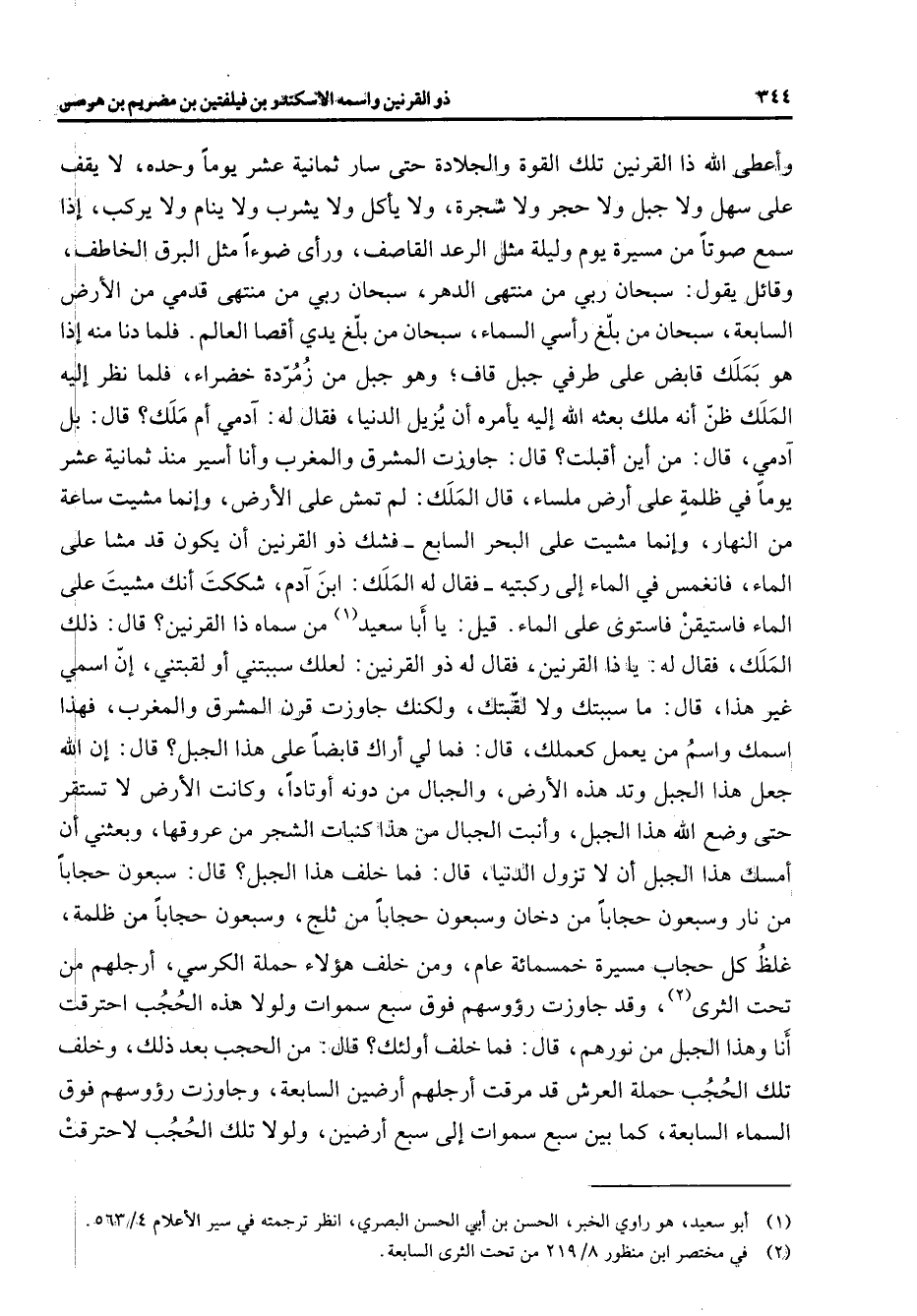 وأعطى الله ذا القرنين تلك القوة والجلادة حتى سار ثمانية عشر يوما وحده لا يقف على سهل ولا جبل ولا حجر ولا شجرة ولا يأكل ولا يشرب ولا ينام ولا يركب إذا سمع صوتا من مسيرة يوم وليلة مثل الرعد القاصف ورأى ضوءا مثل البرق الخاطف وقائل يقول سبحان ربي من منتهى الدهر سبحان ربي من منتهى قدمي من الأرض السابعة سبحان من بلغ رأسي السماء سبحان من بلغ يدي أقصا العالم فلما دنا منه إذا هو بملك قابض على طرفي جبل قاف وهو جبل من زمردة خضراء فلما نظر إليه الملك ظن أنه ملك بعثه الله إليه يأمره أن يزيل الدنيا فقال له آدمي أم ملك قال بل آدمي قال من أين أقبلت قال جاوزت المشرق والمغرب وأنا أسير منذ ثمانية عشر يوما في ظلمة على أرض ملساء قال الملك لم تمش على الأرض وإنما مشيت ساعة من النهار وإنما مشيت على البحر السابع فشك ذو القرنين أن يكون قد مشا على الماء فانغمس في الماء إلى ركبتيه فقال له الملك ابن آدم شككت أنك مشيت على الماء فاستيقن فاستوى على الماء قيل يا أبا سعيد (1) من سماه ذا القرنين قال ذلك الملك فقال له يا ذا القرنين فقال له ذو القرنين لعلك سببتني أو لقبتني إن اسمي غير هذا قال ما سببتك ولا لقبتك ولكنك جاوزت قرن المشرق والمغرب فهذا اسمك واسم من يعمل كعملك قال فما لي أراك قابضا على هذا الجبل قال إن الله جعل هذا الجبل وتد هذه الأرض والجبال من دونه أوتادا وكانت الأرض لا تستقر حتى وضع الله هذا الجبل وأنبت الجبال من هذا كنبات الشجر من عروقها وبعثني أن أمسك هذا الجبل أن لا تزول الدنيا قال فما خلف هذا الجبل قال سبعون حجابا من نار وسبعون حجابا من دخان وسبعون حجابا من ثلج وسبعون حجابا من ظلمة غلظ كل حجاب مسيرة خمسمائة عام ومن خلف هؤلاء حملة الكرسي أرجلهم من تحت الثرى وقد جاوزت رؤوسهم فوق سبع سموات ولولا هذه الحجب احترقت أنا وهذا الجبل من نورهم قال فما خلف أولئك قال من الحجب بعد ذلك وخلف تلك الحجب حملة العرش قد مرقت أرجلهم أرضين السابعة وجاوزت رؤوسهم فوق السماء السابعة كما بين سبع سموات إلى سبع أرضين ولولا تلك الحجب لاحترقت
