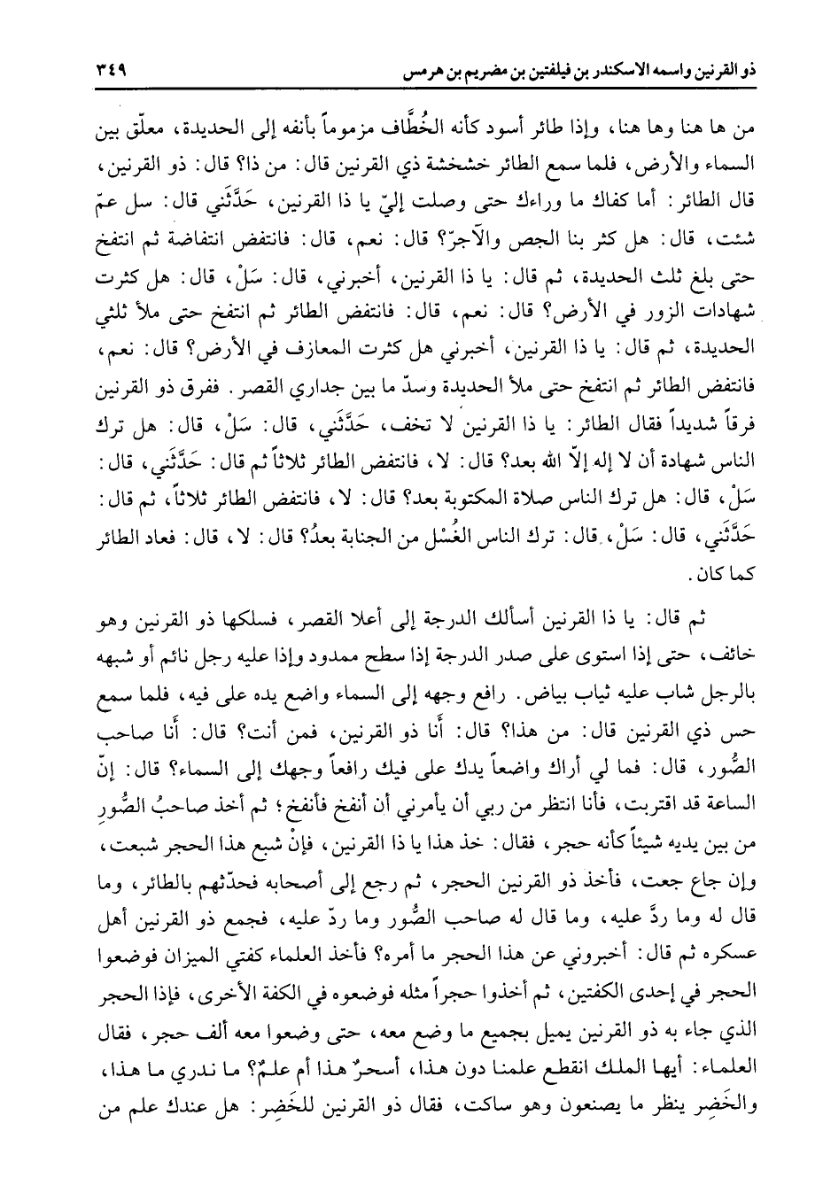 من هاهنا وهاهنا وإذا طائر أسود كأنه الخطاف مزموما بأنفه إلى الحديدة معلق بين السماء والأرض فلما سمع الطائر خشخشة ذي القرنين قال من ذا قال ذو القرنين قال الطائر أما كفاك ما ورائك حتى وصلت إلي يا ذا القرنين حدثني قال سل عم شئت قال هل كثر بنا الجص والآجر قال نعم قال فانتفض انتفاضة ثم انتفخ ثلث الحديدة ثم قال يا ذا القرنين أخبرني قال سل قال هل كثرت شهادات الزور في الأرض قال نعم قال فانتفض الطائر ثم انتفخ حتى ملأ ثلثي الحديدة ثم قال يا ذا القرنين أخبرني هل كثرت المعازف في الأرض قال نعم فانتفض الطائر ثم انتفخ حتى ملأ الحديدة وسد ما بين جداري القصر ففرق ذو القرنين فرقا شديدا فقال الطائر يا ذا القرنين لا تخف حدثني قال سل قال هل ترك الناس شهادة أن لا إله إلا الله بعد قال لا فانتفض الطائر ثلاثا ثم قال حدثني قال سل قال هل ترك الناس صلاة المكتوبة بعد قال لا فانتفض الطائر ثلاثا ثم قال حدثني قال سل قال ترك الناس الغسل من الجنابة بعد قال لا قال فعاد الطائر كما كان ثم قال يا ذا القرنين أسألك الدرجة إلى أعلا القصر فسلكها ذو القرنين وهو خائف حتى إذا استوى على صدر الدرجة إذا سطح ممدود وإذا عليه رجل نائم أو شبهه بالرجل شاب عليه ثياب بياض رافع وجهه إلى السماء واضع يده على فيه فلما سمع حس ذي القرنين قال من هذا قال أنا ذو القرنين فمن أنت قال أنا صاحب الصور قال فما لي أراك واضعا يدك على فيك رافعا وجهك إلى السماء قال إن الساعة قد اقتربت فأنا انتظر من ربي أن يأمرني أن أنفخ فأنفخ ثم أخذ صاحب الصور من بين يديه شيئا كأنه حجر فقال خذ هذا يا ذا القرنين فإن شبع هذا الحجر شبعت وإن جاع جعت فأخذ ذو القرنين الحجر ثم رجع إلى أصحابه فحدثهم بالطائر وما قال له وما رد عليه وما قال له صاحب الصور وما رد عليه فجمع ذو القرنين أهل عسكره ثم قال أخبروني عن هذا الحجر ما أمره فأخذ العلماء كفتي الميزان فوضعوا الحجر في إحدى الكفتين ثم أخذوا حجرا مثله فوضعوه في الكفة الأخرى فإذا الحجر الذي جاء به ذو القرنين يميل بجميع ما وضع معه حتى وضعوا معه ألف حجر فقال العلماء أيها الملك انقطع علمنا دون هذا أسحر هذا أم علم ما ندري ما هذا والخضر ينظر ما يصنعون وهو ساكت فقال ذو القرنين للخضر هل عندك علم من