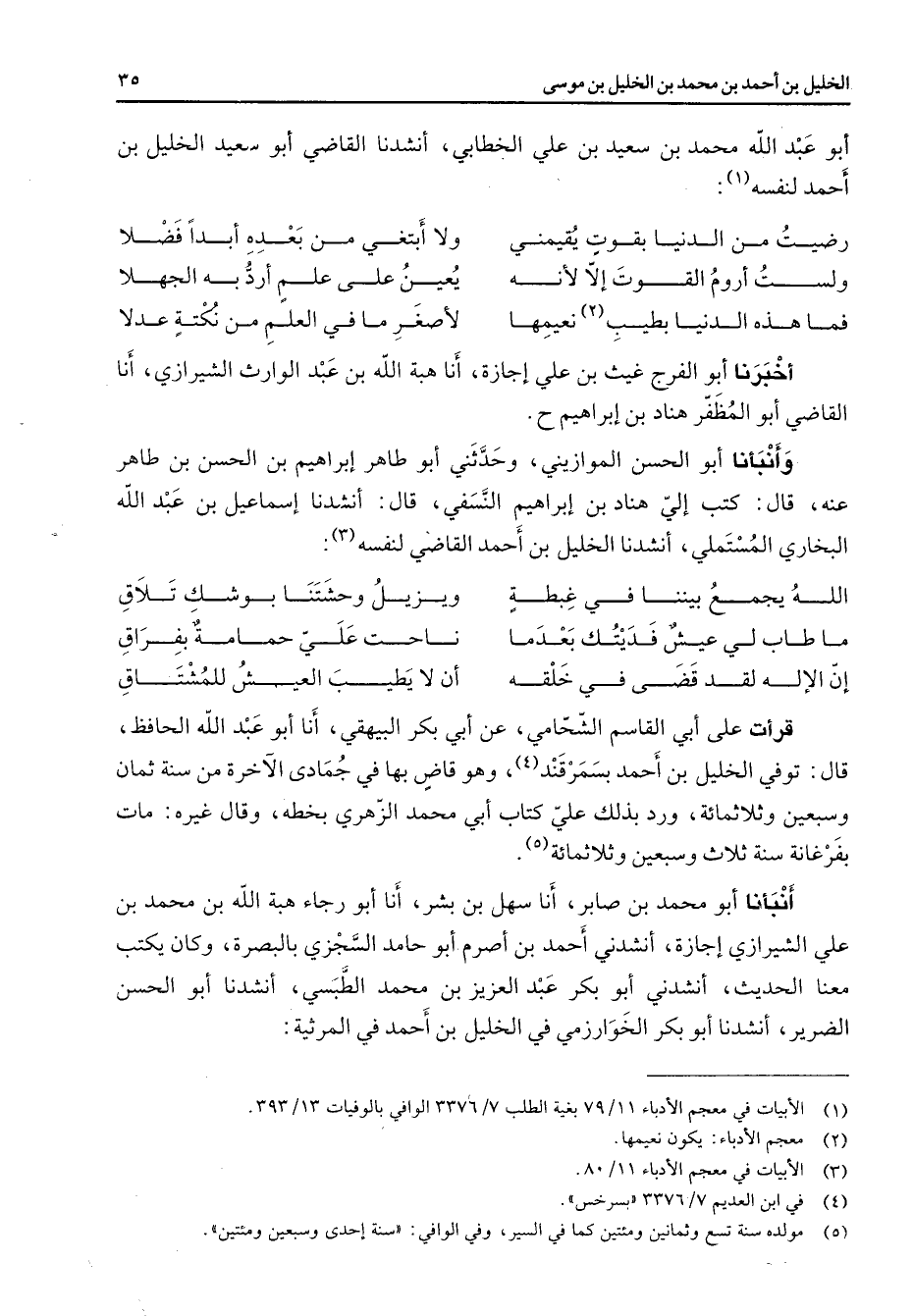أبو عبد الله محمد بن سعيد بن علي الخطابي أنشدنا القاضي أبو سعيد الخليل بن أحمد لنفسه (1) * رضيت من الدنيا بقوت يقيمني * ولا أبتغي من بعده أبدا فضلا ولست أروم القوت إلا لأنه * يعين على علم أرد به الجهلا فما هذه الدنيا بطيب (2) نعيمها * لأصغر ما في العلم من نكتة عدلا * أخبرنا أبو الفرج غيث بن علي إجازة أنا هبة الله بن عبد الوارث الشيرازي أنا القاضي أبو المظفر هناد بن إبراهيم وأنبأنا أبو الحسن الموازيني وحدثني أبو طاهر إبراهيم بن الحسن بن طاهر عنه قال كتب إلي هناد بن إبراهيم النسفي قال أنشدنا إسماعيل بن عبد الله البخاري المستملي أنشدنا الخليل بن أحمد القاضي لنفسه (3) الله يجمع بيننا في غبطة * ويزيل وحشتنا بوشك تلاق ما طاب لي عيش فديتك بعد ما * ناحت علي حمامة بفراق إن الإله لقد قضى في خلقه * إن لا يطيب العيش للمشتاق * قرأت على أبي القاسم الشحامي عن أبي بكر البيهقي أنا أبو عبد الله الحافظ قال توفي الخليل بن أحمد بسمرقند (4) وهو قاض بها في جمادى الآخرة من سنة ثمان وسبعين وثلاثمائة ورد بذلك علي كتاب أبي محمد الزهري بخطه وقال غيره مات بفرغانة سنة ثلاث وسبعين وثلاثمائة (5) أنبأنا أبو محمد بن صابر أنا سهل بن بشر أنا أبو رجاء هبة الله بن محمد بن علي الشيرازي إجازة أنشدني أحمد بن أصرم أبو حامد السجزي بالبصرة وكان يكتب معنا الحديث أنشدني أبو بكر عبد العزيز بن محمد الطبسي أنشدنا أبو الحسن الضرير أنشدنا أبو بكر الخوارزمي في الخليل بن أحمد في المرثية