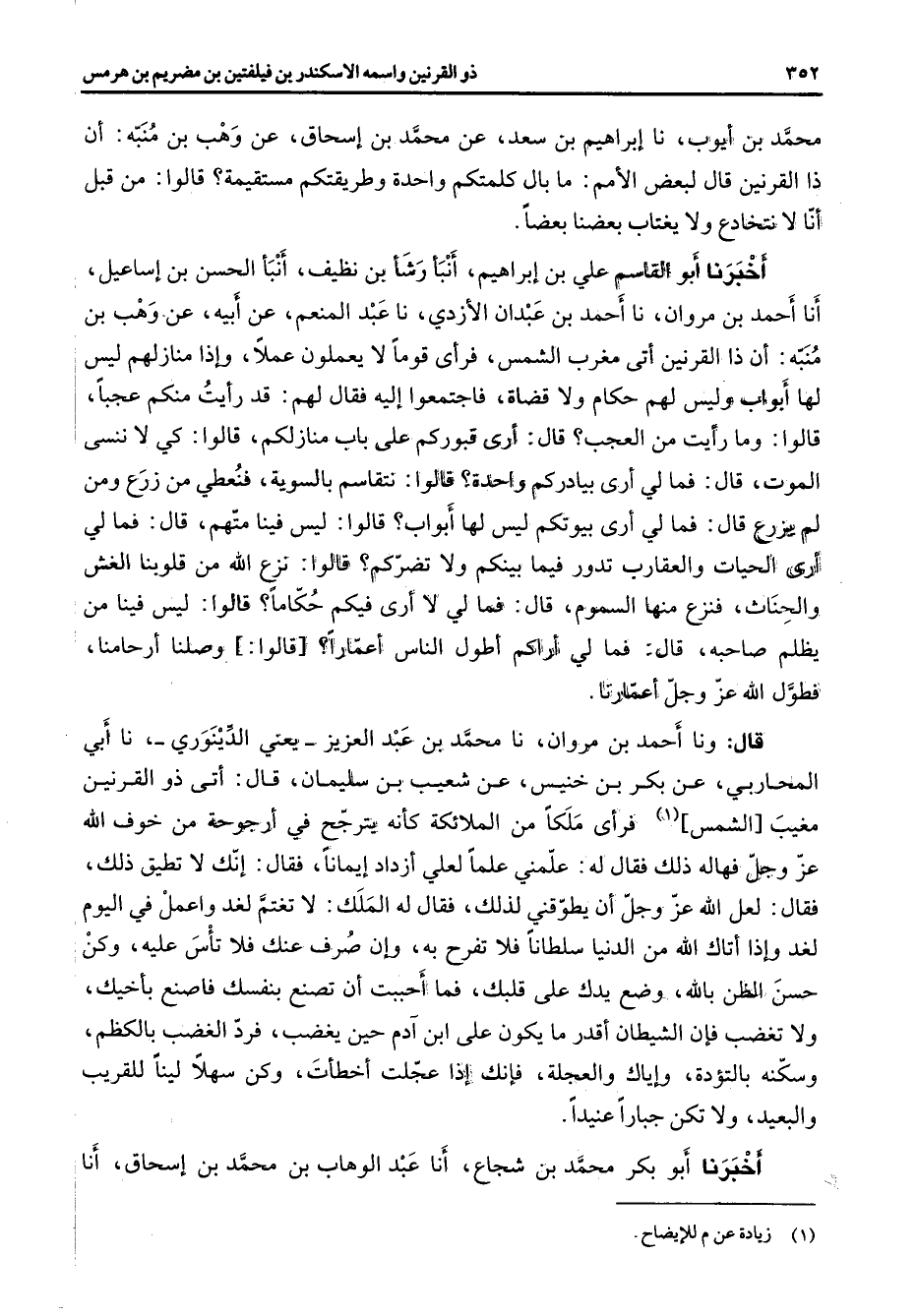 محمد بن أيوب نا إبراهيم بن سعد عن محمد بن إسحاق عن وهب بن منبه أن ذا القرنين قال لبعض الأمم ما بال كلمتكم واحدة وطريقتكم مستقيمة قالوا من قبل أنا لا نتخادع ولا يغتاب بعضنا بعضا أخبرنا أبو القاسم علي بن إبراهيم أنبأ رشأ بن نظيف أنبأ الحسن بن إسماعيل أنا أحمد بن مروان نا أحمد بن عبدان الأزدي نا عبد المنعم عن أبيه عن وهب بن منبه أن ذا القرنين أتى مغرب الشمس فرأى قوما لا يعملون عملا وإذا منازلهم ليس لها أبواب وليس لهم حكام ولا قضاة فاجتمعوا إليه فقال لهم قد رأيت منكم عجبا قالوا وما رأيت من العجب قال أرى قبوركم على باب منازلكم قالوا كي لا ننسى الموت قال فما لي أرى بيادركم واحدة قالوا نتقاسم بالسوية فنعطي من زرع ومن لم يزرع قال فما لي أرى بيوتكم ليس لها أبواب قالوا ليس فينا متهم قال فما لي أرى الحيات والعقارب تدور في ما بينكم ولا تضركم قالوا نزع الله من قلوبنا الغش والحناث فنزع منها السموم قال فما لي لا أرى فيكم حكاما قالوا ليس فينا من يظلم صاحبه قال فما لي أراكم أطول الناس أعمارا قالوا وصلنا أرحامنا فطول الله عز وجل أعمارنا قال ونا أحمد بن مروان نا محمد بن عبد العزيز يعني الدينوري نا أبي المحاربي عن بكر بن خنيس عن شعيب بن سليمان قال أتى ذو القرنين مغيب الشمس (1) فرأى ملكا من الملائكة كأنه يترجح في أرجوحة من خوف الله عز وجل فهاله ذلك فقال له علمني علما لعلي أزداد إيمانا فقال إنك لا تطيق ذلك فقال لعل الله عز وجل أن يطوقني لذلك فقال له الملك لا تغتم لغد واعمل في اليوم لغد وإذا أتاك الله من الدنيا سلطانا فلا تفرح به وإن صرف عنك فلا تأس عليه وكن حسن الظن بالله وضع يدك على قلبك فما أحببت أن تصنع بنفسك فاصنع بأخيك ولا تغضب فإن الشيطان أقدر ما يكون على ابن آدم حين يغضب فرد الغضب بالكظم وسكنه بالتؤدة وإياك والعجلة فإنك إذا عجلت أخطأت وكن سهلا لينا للقريب والبعيد ولا تكن جبارا عنيدا أخبرنا أبو بكر محمد بن شجاع أنا عبد الوهاب بن محمد بن إسحاق أنا