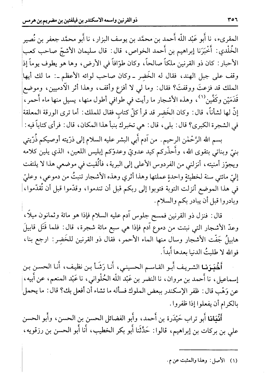 المقرئ نا أبو عبد الله أحمد بن محمد بن يوسف البزار نا أبو محمد جعفر بن نصير الخلدي أخبرنا إبراهيم بن أحمد الخواص قال قال سليمان الأشج صاحب كعب الأحبار كان ذو القرنين ملكا صالحا وكان طوافا في الأرض وها هو يطوف يوما إذ وقف على جبل الهند فقال له الخضر وكان صاحب لوائه الأعظم ما لك أيها الملك قد فزعت ووقفت فقال وما لي لا أفزع وأقف وهذا أثر الآدميين وموضع قدمين وكفين (1) وهذه الأشجار ما رأيت في طوافي أطول منها يسيل منها ماء أحمر إن لها لشأنا قال وكان الخضر قد قرأ كل كتاب فقال للملك أما ترى الورقة المعلقة في الشجرة الكبرى قال بلى قال هي تخبرك بنبأ هذا المكان قال فرأى كتابا فيه بسم الله الرحمن الرحيم من آدم أبي البشر عليه السلام إلى ذريته أوصيكم ذريتي بني وبناتي بتقوى الله وأحذركم كيد عدوي وعدوكم إبليس اللعين الذي يلين كلامه ويجوز أمنيته أنزلني من الفردوس الأعلى إلى البرية فألقيت في موضعي هذا لا يلتفت إلي مائتي سنة لخطيئة واحدة عملتها وهذا أثري وهذه الأشجار تنبت من دموعي وعلي في هذا الموضع أنزلت التوبة فتوبوا إلى ربكم قبل أن تندموا وقدموا قبل أن تقدموا وبادروا قبل أن يبادر بكم والسلام قال فنزل ذو القرنين فمسح جلوس آدم عليه السلام فإذا هو مائة وثمانون ميلا وعد الأشجار التي نبتت من دموع آدم فإذا هي سبع مائة شجرة قال فلما قتل قابيل هابيل جفت الأشجار وسال منها الماء الأحمر فقال ذو القرنين للخضر ارجع بنا فوالله لا طلبت الدنيا بعدها أبدا أخبرنا الشريف أبو القاسم الحسيني أنا رشأ بن نظيف أنا الحسن بن إسماعيل نا أحمد بن مروان نا النضر بن عبد الله الحلواني نا عبد المنعم عن أبيه عن وهب قال ظفر الإسكندر ببعض الملوك فسأله ما تشاء أن أفعل بك قال ما يحمل بالكرام أن يفعلوا إذا ظفروا أنبأنا أبو تراب حيدرة بن أحمد وأبو الفضائل الحسن بن الحسن وأبو الحسن علي بن بركات بن إبراهيم قالوا حدثنا أبو بكر الخطيب أنا أبو الحسن بن رزقويه