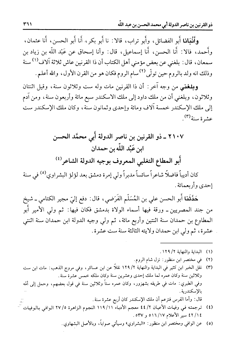 2107 - ذو القرنين بن ناصر الدولة أبي محمد الحسن ابن عبد الله بن حمدان أبو المطاع التغلبي المعروف بوجيه الدولة الشاعر (4) كان أديبا فاضلا شاعرا سائسا مدبرا ولي إمرة دمشق بعد لؤلؤ البشراوي (5) في سنة إحدى وأربعمائة حدثنا أبو الحسن علي بن المسلم الفرضي قال دفع إلي مجير الكتامي شيخ من جند المصريين ورقة فيها أسماء الولاة بدمشق فكان فيها ثم ولي الأمير أبو المطاوع بن حمدان سنة اثنتين وأربع مائة ثم ولي وجيه الدولة ابن حمدان سنة اثنتي عشرة ثم ولي ابن حمدان ولايته الثالثة سنة ست عشرة