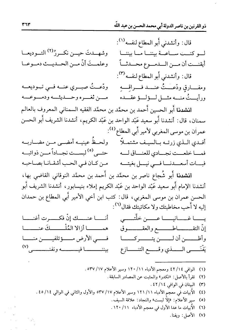 قال وأنشدني أبو المطاع لنفسه (1) لو كنت ساعة بيننا ما بيننا * وشهدت حين نكرر (2) التوديعا أيقنت أن من الدموع محدثا * وعلمت أن من الحديث دموعا * قال وأنشدني أبو المطاع لنفسه (3) * ومفارق ودعت عند فراقه * ودعت صبري عنه في توديعه ورأيت منه مثل لؤلؤ عقده * من ثغره وحديثه ودموعه * أنشدنا أبو الحسين أحمد بن محمد بن محمد الفقيه السمناني المعروف بالعلم سمنان قال أنشدنا أبو سعيد عبد الواحد بن عبد الكريم أنشدنا الشريف أبو الحسن عمران بن موسى المغربي لأمير أبي المطاع (4) أفدي الذي زرته بالسيف مشتملا * ولحظ عينيه أمضى من مضاربه فما خلعت نجادي للعناق له * حتى (5) لبست نجادا من ذوائبه فبات أسعدنا في نيل بغيته * من كان في الحب أشقانا بصاحبه * أنشدنا أبو شجاع ناصر بن محمد بن أحمد بن محمد النوقاني القاضي بها أنشدنا الإمام أبو سعيد عبد الواحد بن عبد الكريم إملاء بنيسابور أنشدنا الشريف أبو الحسن عمران بن موسى المغربي قال كتب ابن أخي الأمير أبي المطاع بن حمدان إليه لا أحب مخاطبتك ولا مكاتبتك فقال (6) * يا غانيا عن خلتي * أنا عنك إن فكرت أغنا إن التقاطع والعقوق * هما أزالا الملك عنا وأظن أن لن يتركا * في الأرض مؤتلفين منا يفنى الذي وقع التنازع * بيننا فيه ونفنى (7)
