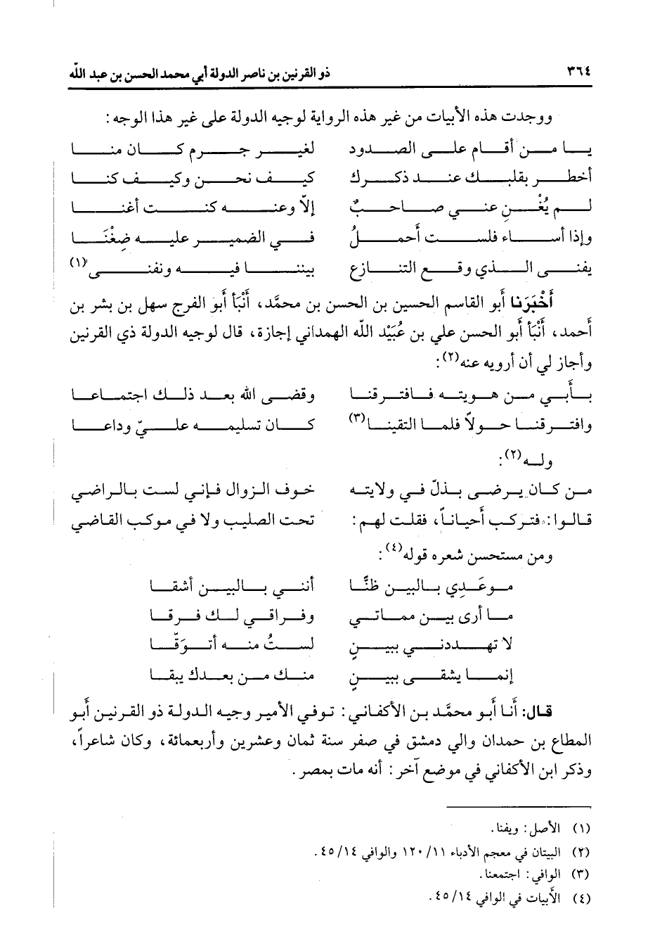 ووجدت هذه الأبيات من غير هذه الرواية لوجيه الدولة على غير هذا الوجه يا من أقام على الصدود * لغير جرم كان منا أخطر بقلبك عند ذكرك * كيف نحن وكيف كنا لم يغن عني صاحب * إلا وعنه كنت أغنا وإذا أساء فلست أحمل * في الضمير عليه ضغنا يفنى الذي وقع التنازع * بيننا فيه ونفنى (1) أخبرنا أبو القاسم الحسين بن الحسن بن محمد أنبأ أبو الفرج سهل بن بشر بن أحمد أنبأ أبو الحسن علي بن عبيد الله الهمداني إجازة قال لوجيه الدولة ذي القرنين وأجاز لي أن أرويه عنه (2) * بأبي من هويته فافترقنا * وقضى الله بعد ذلك اجتماعا وافترقنا حولا فلما التقينا (3) * كان تسليمه علي وداعا * وله (2) * من كان يرضى بذل في ولايته * خوف الزوال فإني لست بالراضي قالوا فتركب أحيانا فقلت لهم * تحت الصليب ولا في موكب القاضي * ومن مستحسن شعره قوله * (4) موعدي بالبين ظنا * أنني بالبين أشقا ما أرى بين مماتي * وفراقي لك فرقا لا تهددني ببين * لست منه أتوقا إنما يشقى ببين * منك من بعدك يبقا * قال أنا أبو محمد بن الأكفاني توفي الأمير وجيه الدولة ذو القرنين أبو المطاع بن حمدان والي دمشق في صفر سنة ثمان وعشرين وأربعمائة وكان شاعرا وذكر ابن الأكفاني في موضع آخر أنه مات بمصر