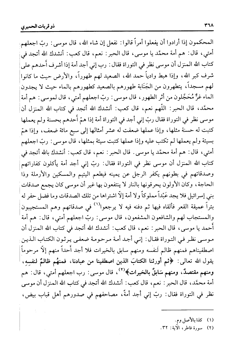 المحكمون إذا أرادوا أن يفعلوا أمرا قالوا نفعل إن شاء الله قال موسى رب اجعلهم أمتي قال هم أمة محمد يا موسى قال الحبر نعم قال كعب أنشدك الله أتجد في كتاب الله المنزل أن موسى نظر في التوراة فقال رب إني أجد أمة إذا أشرف أحدهم على شرف كبر الله وإذا هبط واديا حمد الله الصعيد لهم طهورا والأرض حيث ما كانوا لهم مسجدا يتطهرون من الجنابة طهروهم بالصعيد كطهورهم بالماء حيث لا يجدون الماء غر محجلون من أثر الطهور قال موسى رب اجعلهم أمتي قال لموسى هم أمة محمد قال الحبر اللهم نعم قال كعب أنشدك الله أتجد في كتاب الله المنزل أن موسى نظر في التوراة فقال رب إني أجد في التوراة أمة إذا هم أحدهم بحسنة ولم يعملها كتبت له حسنة مثلها وإذا عملها ضعفت له عشر أمثالها إلى سبع مائة ضعف وإذا هم بسيئة ولم يعملها لم تكتب عليه وإذا عملها كتبت سيئة بمثلها قال موسى رب اجعلهم أمتي قال هم أمة محمد يا موسى قال الحبر نعم قال كعب أنشدك بالله أتجد في كتاب الله المنزل أن موسى نظر في التوراة فقال رب إني أجد أمة يأكلون كفاراتهم وصدقاتهم في بطونهم يكفر الرجل عن يمينه فيطعم اليتيم والمسكين والأرملة وذا الحاجة وكان الأولون يحرقونها بالنار لا ينتفعون بها غير أن موسى كان يجمع صدقات بني إسرائيل فلا يجد عبدا مملوكا ولا أمة إلا اشتراها من تلك الصدقات وما فضل حفر له بئر عميقة القعر فألقاه فيها ثم دفنه فيه لا يرجعوا (1) في صدقاتهم وهم المستجيبون والمستجاب لهم والشافعون المشفعون قال موسى رب اجعلهم أمتي قال هم أمة أحمد يا موسى قال الحبر نعم قال كعب أنشدك الله أتجد في كتاب الله المنزل أن موسى نظر في التوراة فقال أني أجد أمة مرحومة ضعفى يرثون الكتاب الذين اصطفيناهم فمنهم ظالم لنفسه ومنهم سابق بالخيرات فلا أجد أحدا منهم إلا مرحوما يقول الله تعالى " ثم أورثنا الكتاب الذين اصطفينا من عبادنا فمنهم ظالم لنفسه ومنهم مقتصد ومنهم سابق بالخيرات (2) " قال موسى رب اجعلهم أمتي قال هم أمة محمد قال الحبر نعم قال كعب أنشدك الله أتجد في كتاب الله المنزل أن موسى نظر في التوراة فقال رب إني أجد أمة مصاحفهم في صدورهم أهل قباب بيض