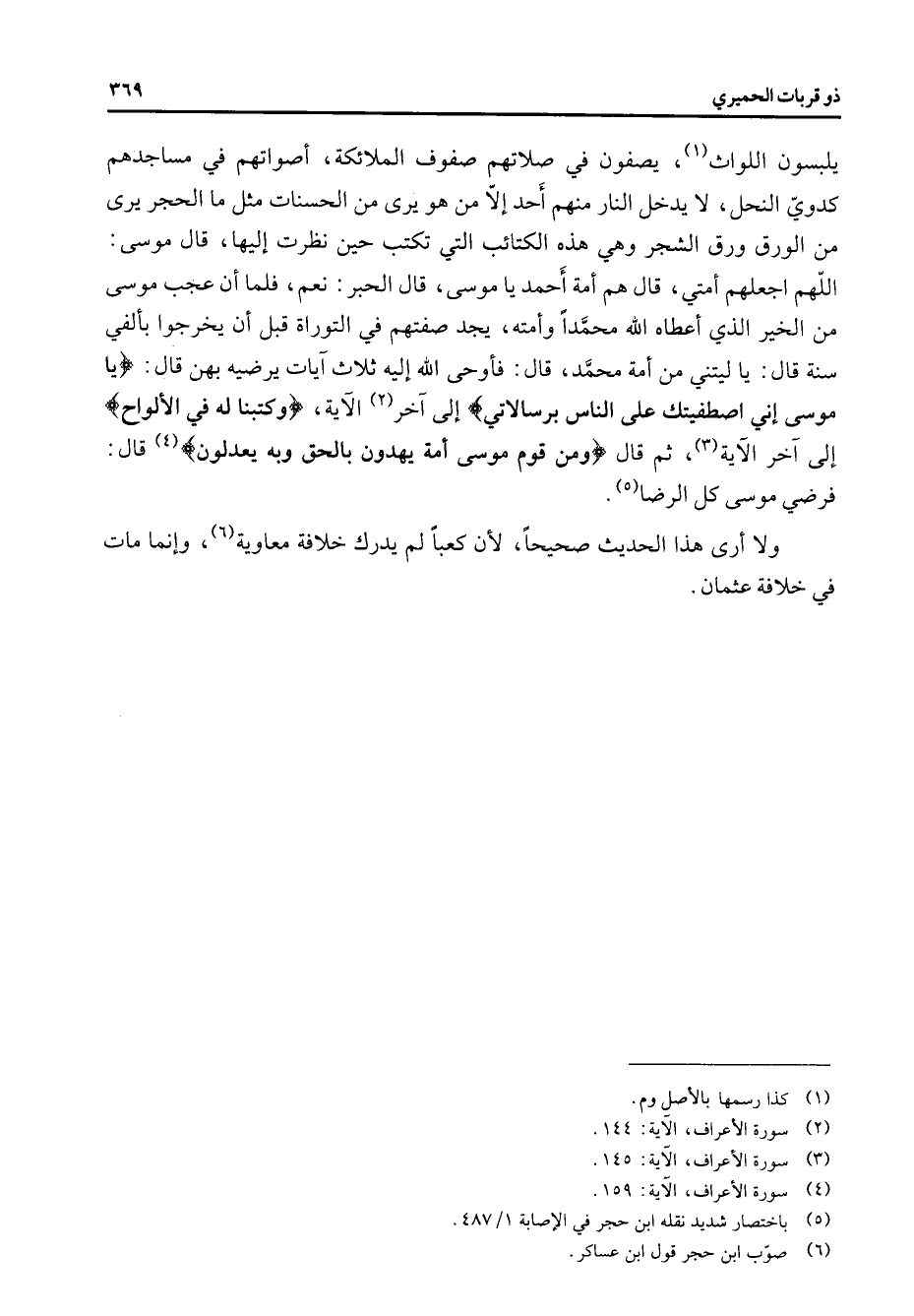 يلبسون اللواث (1) يصفون في صلاتهم صفوف الملائكة أصواتهم في مساجدهم كدوي النحل لا يدخل النار منهم أحد إلا من هو يرى من الحسنات مثل ما الحجر يرى من الورق ورق الشجر وهي هذه الكتائب التي تكتب حين نظرت إليها قال موسى اللهم اجعلهم أمتي قال هم أمة أحمد يا موسى قال الحبر نعم فلما أن عجب موسى من الخير الذي أعطاه الله محمدا وأمته يجد صفتهم في التوراة قبل أن يخرجوا بألفي سنة قال يا ليتني من أمة محمد قال فأوحى الله إليه ثلاث آيات يرضيه بهن قال " يا موسى إني اصطفيتك على الناس برسالاتي " إلى آخر (2) الآية " وكتبنا له في الألواح " إلى آخر الآية (3) ثم قال " ومن قوم موسى أمة يهدون بالحق وبه يعدلون " (4) قال فرضي موسى كل الرضا (5) ولا أرى هذا الحديث صحيحا لأن كعبا لم يدرك خلافة معاوية (6) وإنما مات في خلافة عثمان
