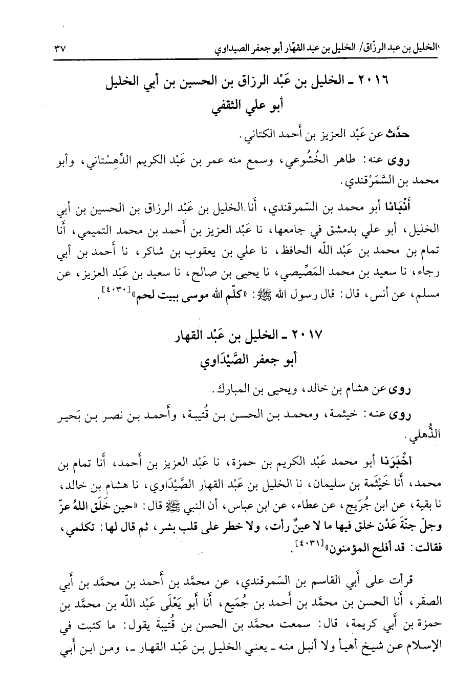 2016 - الخليل بن عبد الرزاق بن الحسين بن أبي الخليل أبو علي الثقفي حدث عن عبد العزيز بن أحمد الكتاني روى عنه طاهر الخشوعي وسمع منه عمر بن عبد الكريم الدهستاني وأبو محمد بن السمرقندي أنبأنا أبو محمد بن السمرقندي أنا الخليل بن عبد الرزاق بن الحسين بن أبي الخليل أبو علي بدمشق في جامعها نا عبد العزيز بن أحمد بن محمد التميمي أنا تمام بن محمد بن عبد الله الحافظ نا علي بن يعقوب بن شاكر نا أحمد بن أبي رجاء نا سعيد بن محمد المصيصي نا يحيى بن صالح نا سعيد بن عبد العزيز عن مسلم عن أنس قال قال رسول الله (صلى الله عليه وسلم) كلم الله موسى ببيت لحم