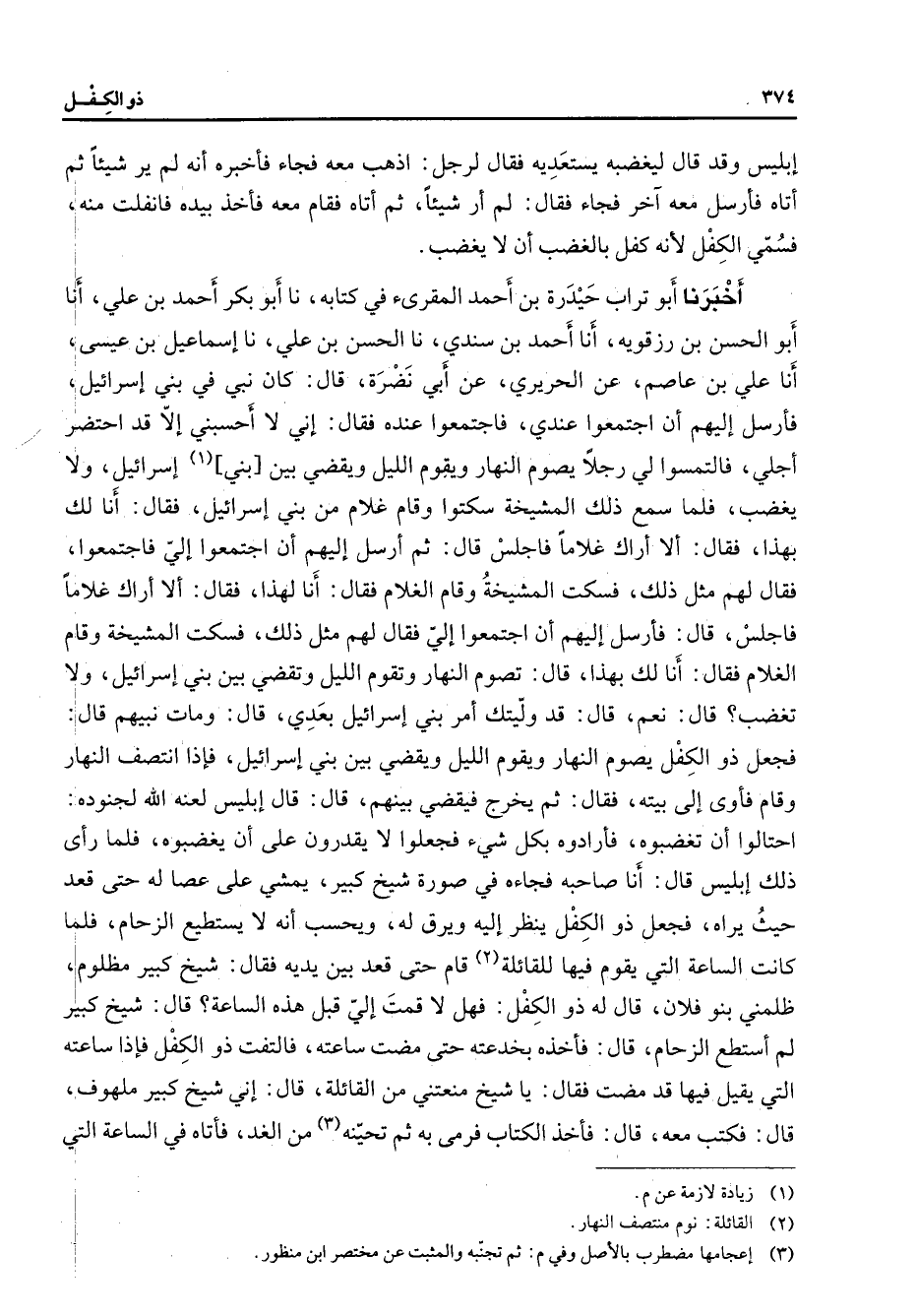 إبليس وقد قال ليغضبه يستعديه فقال لرجل اذهب معه فجاء فأخبره أنه لم ير شيئا ثم أتاه فأرسل معه آخر فجاء فقال لم أر شيئا ثم أتاه فقام معه فأخذ بيده فانفلت منه فسمي الكفل لأنه كفل بالغضب أن لا يغضب أخبرنا أبو تراب حيدرة بن أحمد المقرئ في كتابه نا أبو بكر أحمد بن علي أنا أبو الحسن بن رزقويه أنا أحمد بن سندي نا الحسن بن علي نا إسماعيل بن عيسى أنا علي بن عاصم عن الحريري عن أبي نظرة قال كان نبي في بني إسرائيل فأرسل إليهم أن اجتمعوا عندي فاجتمعوا عنده فقال إني لا أحسبني إلا قد احتضر أجلي فالتمسوا لي رجلا يصوم النهار ويقوم الليل ويقضي بين بني (1) إسرائيل ولا يغضب فلما سمع ذلك المشيخة سكتوا وقام غلام من بني إسرائيل فقال أنا لك بهذا فقال ألا أراك غلاما فاجلس قال ثم أرسل إليهم أن اجتمعوا إلي فاجتمعوا فقال لهم مثل ذلك فسكت المشيخة وقام الغلام فقال أنا لهذا فقال ألا أراك غلاما فاجلس قال فأرسل إليهم أن اجتمعوا إلي فقال لهم مثل ذلك فسكت المشيخة وقام الغلام فقال أنا لك بهذا قال تصوم النهار وتقوم الليل وتقضي بين بني إسرائيل ولا تغضب قال نعم قال قد وليتك أمر بني إسرائيل بعدي قال ومات نبيهم قال فجعل ذو الكفل يصوم النهار ويقوم الليل ويقضي بين بني إسرائيل فإذا انتصف النهار وقام فأوى إلى بيته فقال ثم يخرج فيقضي بينهم قال قال إبليس لعنه الله لجنوده احتالوا أن تغضبوه فأرادوه بكل شئ فجعلوا لا يقدرون على أن يغضبوه فلما رأى ذلك إبليس قال أنا صاحبه فجاءه في صورة شيخ كبير يمشي على عصا له حتى قعد حيث يراه فجعل ذو الكفل ينظر إليه ويرق له ويحسب أنه لا يستطيع الزحام فلما كانت الساعة التي يقوم فيها للقائلة (2) قام حتى قعد بين يديه فقال شيخ كبير مظلوم ظلمني بنو فلان قال له ذو الكفل فهل لا قمت إلي قبل هذه الساعة قال شيخ كبير لم أستطيع الزحام قال فأخذه بخدعته حتى مضت ساعته فالتفت ذو الكفل فإذا ساعته التي يقيل فيها قد مضت فقال يا شيخ منعتني من القائلة قال إني شيخ كبير ملهوف قال فكتب معه قال فأخذ الكتاب فرمى به ثم تحينه (3) من الغد فأتاه في الساعة التي