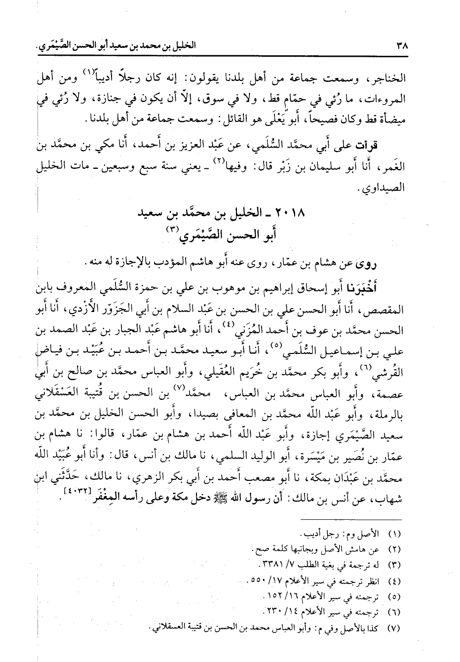 2018 - الخليل بن محمد بن سعيد أبو الحسن الصيمري (3) روى عن هشام بن عمار روى عنه أبو هاشم المؤدب بالإجازة له منه أخبرنا أبو إسحاق إبراهيم بن موهوب بن علي بن حمزة السلمي المعروف بابن المقصص أنا أبو الحسن علي بن الحسن بن عبد السلام بن أبي الجزور الأزدي أنا أبو الحسن محمد بن عوف بن أحمد المزني (4) أنا أبو هاشم عبد الجبار بن عبد الصمد بن علي بن إسماعيل السلمي (5) أنا أبو سعيد محمد بن أحمد بن عبيد بن فياض القرشي (6) وأبو بكر محمد بن خريم العقيلي وأبو العباس محمد بن صالح بن أبي عصمة وأبو العباس محمد بن العباس محمد (7) بن الحسن بن قتيبة العسقلاني بالرملة وأبو عبد الله محمد بن المعافى بصيدا وأبو الحسن الخليل بن محمد بن سعيد الصيمري إجازة وأبو عبد الله أحمد بن هشام بن عمار قالوا نا هشام بن عمار بن نصير بن ميسرة أبو الوليد السلمي نا مالك بن أنس قال وأنا أبو عبيد الله محمد بن عبدان بمكة نا أبو مصعب أحمد بن أبي بكر الزهري نا مالك حدثني ابن شهاب عن أنس بن مالك أن رسول الله (صلى الله عليه وسلم) دخل مكة وعلى رأسه المغفر