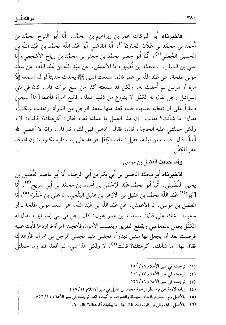 فأخبرناه أبو البركات عمر بن إبراهيم بن محمد أنا أبو الفرح محمد بن أحمد بن محمد بن علان الخازن (1) أنا القاضي أبو عبد الله محمد بن عبد الله بن الحسين الجعفي (2) أنبأ أبو جعفر محمد بن جعفر بن محمد بن رياح الأشجعي نا علي بن المنذر نا محمد بن فضيل نا الأعمش عن عبد الله بن عبد الله عن سعد مولى طلحة عن عبد الله بن عمر قال سمعت النبي (صلى الله عليه وسلم) يحدث حديثا لو لم أسمعه إلا مرة أو مرتين لم أحدث به ولكن قد سمعته أكثر من سبع مرات قال كان في بني إسرائيل رجل يقال له الكفل لا يتورع من ذنب عمله فاتبع امرأة فأعطاها سبعين دينارا على أن تعطيه نفسها فلما قعد منها مقعد الرجل من المرأة ارتعدت وبكت فقال ما شأنك فقالت إن هذا العمل ما عملته قط فقال أكرهتك قالت لا ولكن حملتني عليه الحاجة قال فقال اذهبي فهي لك ثم قال والله لا أعصى الله أبدا قال فمات من ليلته فقيل مات الكفل فوجد على باب داره مكتوب إن الله قد غفر للكفل وأما حديث الفضل بن موسى فأخبرناه أبو محمد الحسن بن أبي بكر بن أبي الرضا أنا أبو عاصم الفضيل بن يحيى الفضيلي أنبأ أبو محمد عبد الرحمن بن أحمد بن محمد بن أبي شريح (3) أنا أبو (4) عبد الله محمد بن عقيل بن الأزهر بن عقيل البلخي نا علي بن خشرم (5) نا الفضل بن موسى نا الأعمش عن عبد الله بن عبد الله عن سعد مولى طلحة أو سعيد شك علي قال سمعت ابن عمر يقول كان رجل في بني إسرائيل يقال له الكفل يعمل بالمعاصي ويقطع الطريق ويغصب الأموال فأعجبته امرأة فراودها فأبت عليه فرضيت بعد أن يجعل لها ستين دينارا فجلس منها مجلس الرجل من امرأته فأرعدت فقال لها ما شأنك أكرهتك قالت (6) لا ولكن هذا شئ لم أفعله قط وما حملني