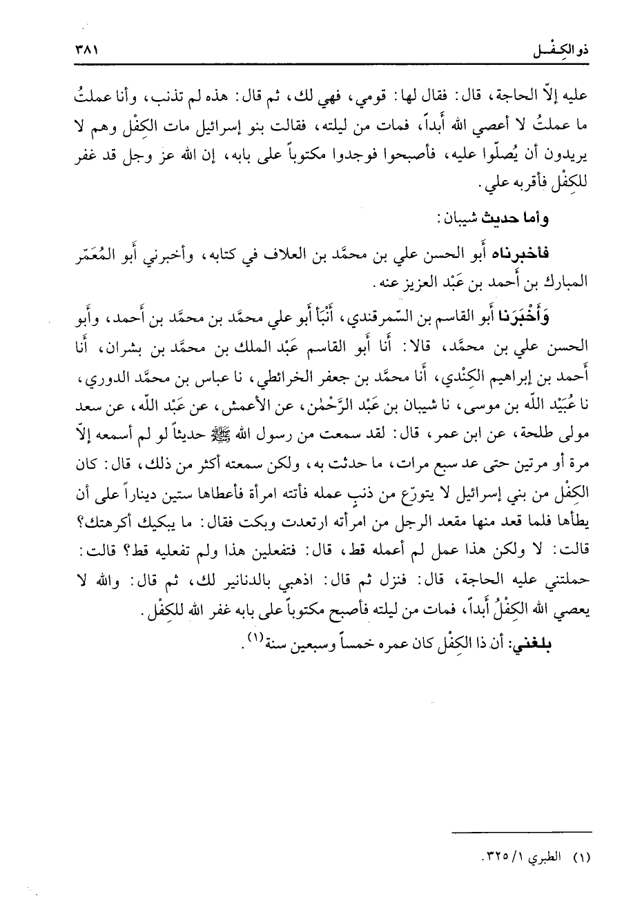 عليه إلا الحاجة قال فقال لها قومي فهي لك ثم قال هذه لم تذنب وأنا عملت ما عملت لا أعصي الله أبدا فمات من ليلته فقالت بنو إسرائيل مات الكفل وهم لا يريدون أن يصلوا عليه فأصبحوا فوجدوا مكتوبا على بابه إن الله عز وجل قد غفر للكفل فأقربه علي وأما حديث شيبان فأخبرناه أبو الحسن علي بن محمد بن العلاف في كتابه وأخبرني أبو المعمر المبارك بن أحمد بن عبد العزيز عنه وأخبرنا أبو القاسم بن السمرقندي أنبأ أبو علي محمد بن محمد بن أحمد وأبو الحسن علي بن محمد قالا أنا أبو القاسم عبد الملك بن محمد بن بشران أنا أحمد بن إبراهيم الكندي أنا محمد بن جعفر الخرائطي نا عباس بن محمد الدوري نا عبيد الله بن موسى نا شيبان بن عبد الرحمن عن الأعمش عن عبد الله عن سعد مولى طلحة عن ابن عمر قال لقد سمعت من رسول الله (صلى الله عليه وسلم) حديثا لو لم أسمعه إلا مرة أو مرتين حتى عد سبع مرات ما حدثت به ولكن سمعته أكثر من ذلك قال كان الكفل من بني إسرائيل لا يتورع من ذنب عمله فأتته امرأة فأعطاها ستين دينارا على أن يطأها فلما قعد منها مقعد الرجل من امرأته ارتعدت وبكت فقال ما يبكيك أكرهتك قالت لا ولكن هذا عمل لم أعمله قط قال فتفعلين هذا ولم تفعليه قط قالت حملتني عليه الحاجة قال فنزل ثم قال اذهبي بالدنانير لك ثم قال والله لا يعصي الله الكفل أبدا فمات من ليلته فأصبح مكتوبا على بابه غفر الله للكفل بلغني أن ذا الكفل كان عمره خمسا وسبعين سنة " (1)