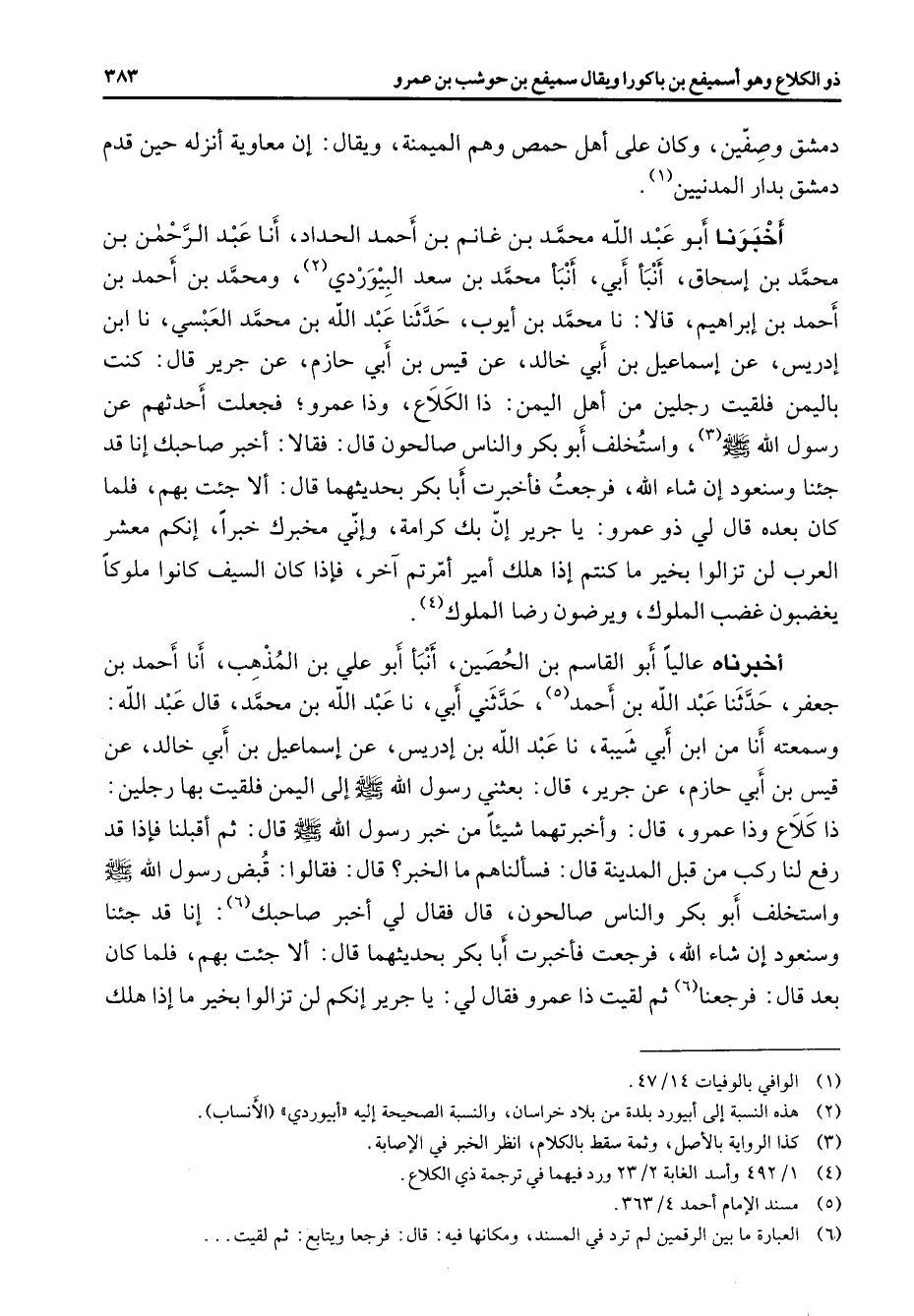 دمشق وصفين وكان على أهل حمص وهم الميمنة ويقال إن معاوية أنزله حين قدم دمشق بدار المدنيين (1) أخبرنا أبو عبد الله محمد بن غانم بن أحمد الحداد أنا عبد الرحمن بن محمد بن إسحاق أنبأ أبي أنبأ محمد بن سعد البيوردي (2) ومحمد بن أحمد بن أحمد بن إبراهيم قالا نا محمد بن أيوب حدثنا عبد الله بن محمد العبسي نا ابن إدريس عن إسماعيل بن أبي خالد عن قيس بن أبي حازم عن جرير قال كنت باليمن فلقيت رجلين من أهل اليمن ذا الكلاع وذا عمرو فجعلت أحدثهم عن رسول الله (صلى الله عليه وسلم) (3) واستخلف أبو بكر والناس صالحون قال فقالا أخبر صاحبك إنا قد جئنا وسنعود إن شاء الله فرجعت فأخبرت أبا بكر بحديثهما قال ألا جئت بهم فلما كان بعده قال لي ذو عمرو يا جرير إن بك كرامة وإني مخبرك خبرا إنكم معشر العرب لن تزالوا بخير ما كنتم إذا هلك أمير أمرتم آخر فإذا كان السيف كانوا ملوكا يغضبون غضب الملوك ويرضون رضا الملوك (4) أخبرناه عاليا أبو القاسم بن الحصين أنبأ أبو علي بن المذهب أنا أحمد بن جعفر حدثنا عبد الله بن أحمد (5) حدثني أبي نا عبد الله بن محمد قال عبد الله وسمعته أنا من ابن أبي شيبة نا عبد الله بن إدريس عن إسماعيل بن أبي خالد عن قيس بن أبي حازم عن جرير قال بعثني رسول الله (صلى الله عليه وسلم) إلى اليمن فلقيت بها رجلين ذا كلاع وذا عمرو قال وأخبرتهما شيئا من خبر رسول الله (صلى الله عليه وسلم) قال ثم أقبلنا فإذا قد رفع لنا ركب من قبل المدينة قال فسألناه ما الخبر قال فقالوا قبض رسول الله (صلى الله عليه وسلم) واستخلف أبو بكر والناس صالحون قال فقال لي أخبر صاحبك (6) إنا قد جئنا وسنعود إن شاء الله فرجعت فأخبرت أبا بكر بحديثهما قال ألا جئت بهم فلما كان بعد قال فرجعنا (6) ثم لقيت ذا عمرو فقال لي يا جرير إنكم لن تزالوا بخير ما إذا هلك