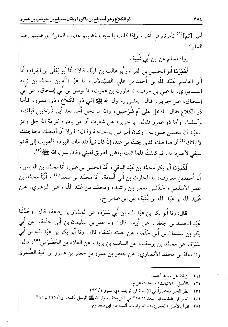 أمير ثم (1) تأمرتم في آخر وإذا كانت بالسيف غضبتم غضب الملوك ورضيتم رضا الملوك رواه مسلم عن ابن أبي شيبة أخبرنا أبو الحسين بن الفراء وأبو غالب بن البنا قالا أنا أبو يعلى بن الفراء أنا أبو القاسم عبيد الله بن أحمد بن علي الصيدلاني نا عبد الله بن محمد بن زياد النيسابوري نا علي بن حرب نا هارون بن عمران نا يونس بن أبي إسحاق عن أبي إسحاق عن جرير قال بعثني رسول الله (صلى الله عليه وسلم) إلى ذي الكلاع وذي عمرو فأما ذو الكلاع فقال ادخل على أم شرحبيل والله ما دخل أحد بعد أبي شرحبيل قبلك وأسلما وأما ذو عمرو فقال يا جرير هل شعرت أن من بادئ كرامة الله وجل وعز للعبد أن يحسن صورته وكان أمر لي بدجاجة وقال لولا أن أمنعك دجاجتك لأنباتك (2) أن صاحبك الذي جئت من عنده إن كان نبيا فقد مات اليوم فأهويت إلى قائم سيفي لأضربه به ثم كففت فلما كنت ببعض الطريق لقيني وفاة رسول الله (صلى الله عليه وسلم) (3) أخبرنا أبو بكر محمد بن عبد الباقي أنبأ الحسن بن علي أنا محمد بن العباس أنا أحمد بن معروف نا الحارث بن أبي أسامة أنا محمد بن سعد (4) أنبأ محمد بن عمر الأسلمي حدثني معمر بن راشد ومحمد بن عبد الله عن الزهري عن عبيد الله بن عبد الله بن عتبة عن ابن عباس قال ونا أبو بكر بن عبد الله بن أبي سبرة عن المسور بن رفاعة قال وحدثنا عبد الحميد بن جعفر عن أبيه قال ونا عمر بن سليمان بن أبي حثمة عن أبي بكر بن سليمان بن أبي حثمة عن جدته الشفاء قال ونا أبو بكر بن عبد الله بن أبي سبرة عن محمد بن يوسف عن السائب بن يزيد عن العلاء بن الحضرمي (5) قال ونا معاذ بن محمد الأنصاري عن جعفر بن عمرو بن جعفر بن عمرو بن أمية الضمري