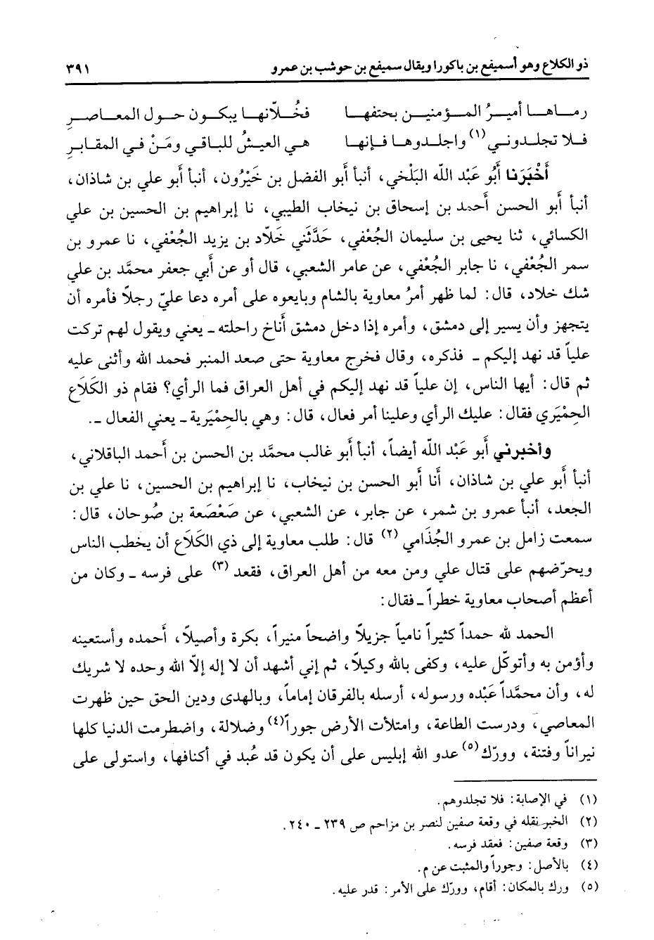 رماها أمير المؤمنين بحتفها * فخلانها يبكون حول المعاصر فلا تجلدوني (1) واجلدوها فإنها * هي العيش للباقي ومن في المقابر * أخبرنا أبو عبد الله البلخي أنبأ أبو الفضل بن خيرون أنبأ أبو علي بن شاذان أنبأ أبو الحسن أحمد بن إسحاق بن نيخاب الطيبي نا إبراهيم بن الحسين بن علي الكسائي ثنا يحيى بن سليمان الجعفي حدثني خلاد بن يزيد الجعفي نا عمرو بن سمر الجعفي نا جابر الجعفي عن عامر الشعبي قال أو عن أبي جعفر محمد بن علي شك خلاد قال لما ظهر أمر معاوية بالشام وبايعوه على أمره دعا علي رجلا فأمره أن يتجهز وأن يسير إلى دمشق وأمره إذا دخل دمشق أناخ راحلته يعني ويقول لهم تركت عليا قد نهد إليكم فذكره وقال فخرج معاوية حتى صعد المنبر فحمد الله وأثنى عليه ثم قال أيها الناس إن عليا قد نهد إليكم في أهل العراق فما الرأي فقام ذو الكلاع الحميري فقال عليك الرأي وعلينا أمر فعال قال وهي بالحميرية يعني الفعال وأخبرني أبو عبد الله أيضا أنبأ أبو غالب محمد بن الحسن بن أحمد الباقلاني أنبأ أبو علي بن شاذان أنا أبو الحسن بن نيخاب نا إبراهيم بن الحسين نا علي بن الجعد أنبأ عمرو بن شمر عن جابر عن الشعبي عن صعصعة بن صوحان قال سمعت زامل بن عمرو الجذامي (2) قال طلب معاوية إلى ذي الكلاع أن يخطب الناس ويحرضهم على قتال علي ومن معه من أهل العراق فقعد (3) على فرسه وكان من أعظم أصحاب معاوية خطرا فقال الحمد لله حمدا كثيرا ناميا جزيلا واضحا منيرا بكرة وأصيلا أحمده وأستعينه وأؤمن به وأتوكل عليه وكفى بالله وكيلا ثم إني أشهد أن لا إله إلا الله وحده لا شريك له وأن محمدا عبده ورسوله أرسله بالفرقان إماما وبالهدى ودين الحق حين ظهرت المعاصي ودرست الطاعة وامتلأت الأرض جورا (4) وضلالة واضطرمت الدنيا كلها نيرانا وفتنة وورك (5) عدو الله إبليس على أن يكون قد عبد في أكنافها واستولى على