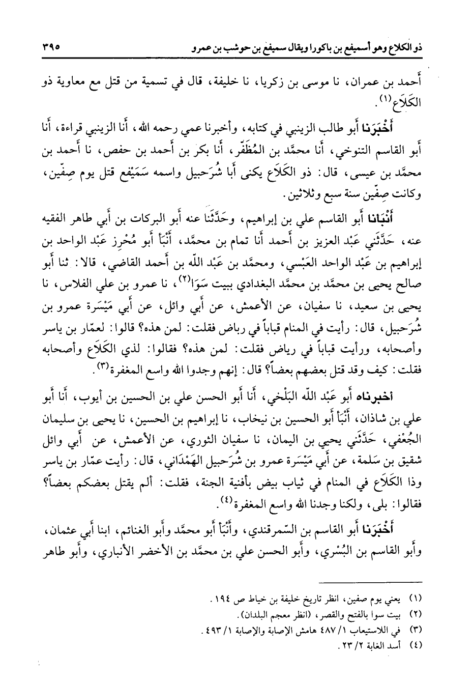 أحمد بن عمران نا موسى بن زكريا نا خليفة قال في تسمية من قتل مع معاوية ذو الكلاع (1) أخبرنا أبو طالب الزينبي في كتابه وأخبرنا عمي رحمه الله أنا الزينبي قراءة أنا أبو القاسم التنوخي أنا محمد بن المظفر أنا بكر بن أحمد بن حفص نا أحمد بن محمد بن عيسى قال ذو الكلاع يكنى أبا شرحبيل واسمه سميفع قتل يوم صفين وكانت صفين سنة سبع وثلاثين أبنأنا أبو القاسم علي بن إبراهيم وحدثنا عنه أبو البركات بن أبي طاهر الفقيه عنه حدثني عبد العزيز بن أحمد أنا تمام بن محمد أنبأ أبو محرز عبد الواحد بن إبراهيم بن عبد الواحد العبسي ومحمد بن عبد الله بن أحمد القاضي قالا ثنا أبو صالح يحيى بن محمد بن محمد البغدادي ببيت سوا (2) نا عمرو بن علي الفلاس نا يحيى بن سعيد نا سفيان عن الأعمش عن أبي وائل عن أبي ميسرة عمرو بن شرحبيل قال رأيت في المنام قبابا في رباض فقلت لمن هذه قالوا لعمار بن ياسر وأصحابه ورأيت قبابا في رياض فقلت لمن هذه فقالوا لذي الكلاع وأصحابه فقلت كيف وقد قتل بعضهم بعضا قال إنهم وجدوا الله واسع المغفرة (3) أخبرناه أبو عبد الله البلخي أنا أبو الحسن علي بن الحسين بن أيوب أنا أبو علي بن شاذان أنبأ أبو الحسين بن نيخاب نا إبراهيم بن الحسين نا يحيى بن سليمان الجعفي حدثني يحيى بن اليمان نا سفيان الثوري عن الأعمش عن أبي وائل شقيق بن سلمة عن أبي ميسرة عمرو بن شرحبيل الهمداني قال رأيت عمار بن ياسر وذا الكلاع في المنام في ثياب بيض بأفنية الجنة فقلت ألم يقتل بعضكم بعضا فقالوا بلى ولكن وجدنا الله واسع المغفرة (4) أخبرنا أبو القاسم بن السمرقندي وأنبأ أبو محمد وأبو الغنائم ابنا أبي عثمان وأبو القاسم بن البسرى وأبو الحسن علي بن محمد بن الأخضر الأنباري وأبو طاهر