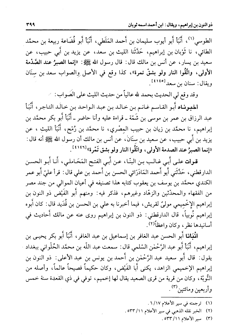 الطوسي (1) أنبأ أبو أيوب سليمان بن أحمد الملطي أنبأ أبو قضاعة ربيعة بن محمد الطائي نا ثوبان بن إبراهيم حدثنا الليث بن سعد عن يزيد بن أبي حبيب عن سعيد بن يسار عن أنس بن مالك قال قال رسول الله (صلى الله عليه وسلم) إنما الصبر عند الصدمة الأولى واتقوا النار ولو بشق تمرة كذا وقع في الأصل والصواب سعد بن سنان ويقال سنان بن سعد وقد وقع لي الحديث بحمد لله عاليا من حديث الليث على الصواب أخبرناه أبو القاسم غانم بن خالد بن عبد الواحد بن خالد التاجر أنبأ عبد الرزاق بن عمر بن موسى بن شمة قراءة عليه وأنا حاضر أنبأ أبو بكر محمد بن إبراهيم نا محمد بن زيان بن حبيب المصري نا محمد بن رمح أنبأ الليث عن يزيد بن أبي حبيب عن سعيد بن سنان عن أنس بن مالك أن رسول الله (صلى الله عليه وسلم) أنه قال إنما الصبر عند الصدمة الأولى واتقوا النار ولو بشق تمرة قرأت على أبي غالب بن البنا عن أبي الفتح المحاملي أنا أبو الحسن الدارقطني حدثني أبو أحمد المادرائي الحسن بن أحمد بن علي قال قرأ علي أبو عمر الكندي محمد بن يوسف بن يعقوب كتابه هذا تصنيفه في أعيان الموالي من جند مصر من الفقهاء والمحدثين والزهاد وغيرهم فذكر فيه ومنهم أبو الفيض ذو النون بن إبراهيم الإخميمي مولى لقريش فيما أخبرنا به علي بن الحسن بن قديد قال كان أبوه إبراهيم نوبيا قال الدارقطني ذو النون بن إبراهيم روى عنه عن مالك أحاديث في أسانيدها نظر وكان واعظا (2) أنبأنا أبو الحسن عبد الغافر بن إسماعيل بن عبد الغافر أنبأ أبو بكر يحيى بن إبراهيم أنبأ أبو عبد الرحمن السلمي قال سمعت عبد الله بن محمد الحلواني ببغداد يقول قال أبو سعيد عبد الرحمن بن أحمد بن يونس بن عبد الأعلى ذو النون بن إبراهيم الإخميمي الزاهد يكنى أبا الفيض وكان حكيما فصيحا عالما أصله من النوبة وكان من قرية من قرى الصعيد يقال لها إخميم توفي في ذي القعدة سنة خمس وأربعين ومائتين (3)