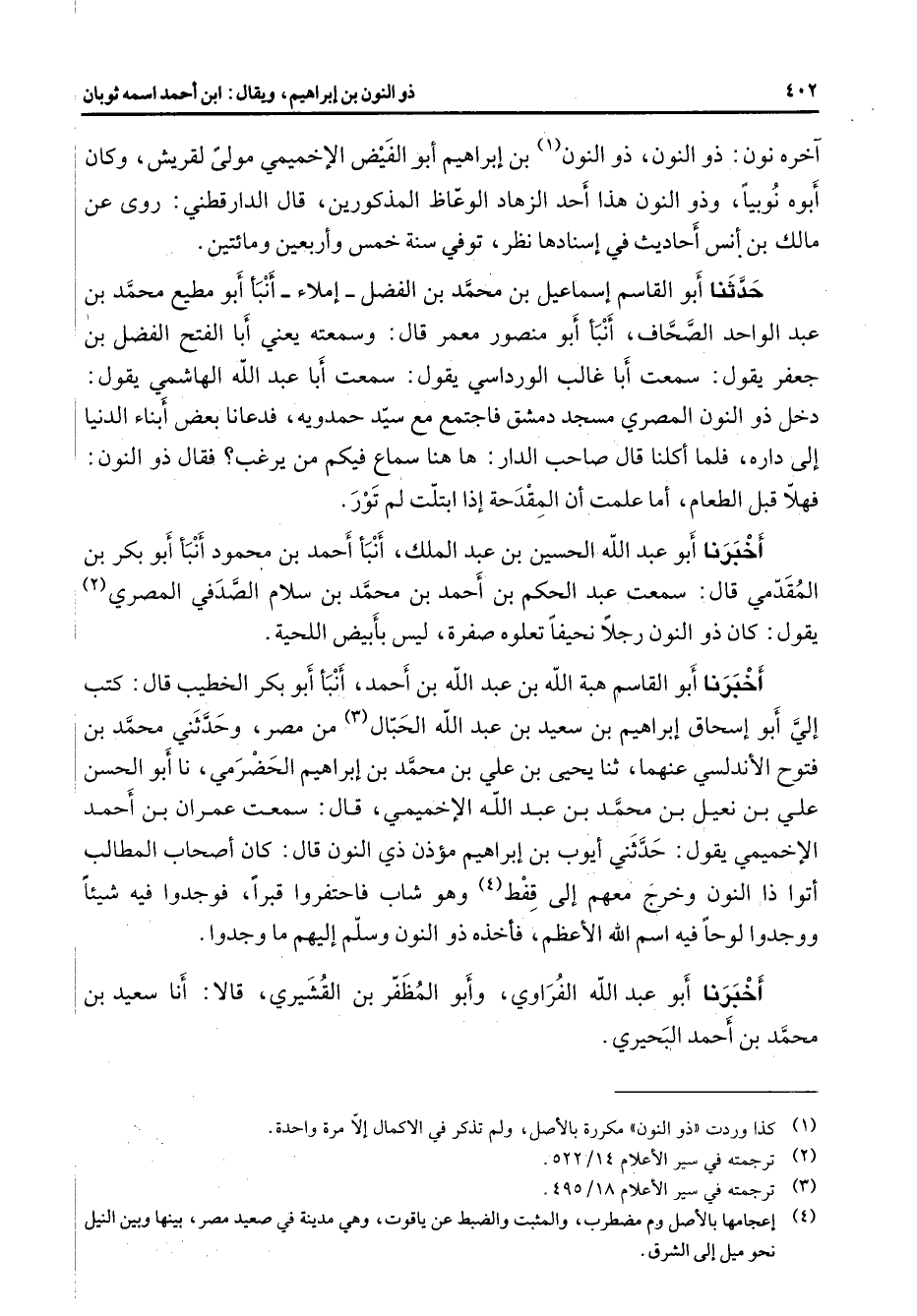 آخره نون ذو النون ذو النون (1) بن إبراهيم أبو الفيض الإخميمي مولى لقريش وكان أبوه نوبيا وذو النون هذا أحد الزهاد الوعاظ المذكورين قال الدارقطني روى عن مالك بن أنس أحاديث في إسنادها نظر توفي سنة خمس وأربعين ومائتين حدثنا أبو القاسم إسماعيل بن محمد بن الفضل إملاء أنبأ أبو مطيع محمد بن عبد الواحد الصحاف أنبأ أبو منصور معمر قال وسمعته يعني أبا الفتح الفضل بن جعفر يقول سمعت أبا غالب الورداسي يقول سمعت أبا عبد الله الهاشمي يقول دخل ذو النون المصري مسجد دمشق فاجتمع مع سيد حمدوية فدعانا بعض أبناء الدنيا إلى داره فلما أكلنا قال صاحب الدار هاهنا سماع فيكم من يرغب فقال ذو النون فهلا قبل الطعام أما علمت أن المقدحة إذا ابتلت لم تور أخبرنا أبو عبد الله الحسين بن عبد الملك أنبأ أحمد بن محمود أنبأ أبو بكر بن المقدمي قال سمعت عبد الحكم بن أحمد بن محمد بن سلام الصدفي المصري (2) يقول كان ذو النون رجلا نحيفا تعلوه صفرة ليس بأبيض اللحية أخبرنا أبو القاسم هبة الله بن عبد الله بن أحمد أنبأ أبو بكر الخطيب قال كتب إلي أبو إسحاق إبراهيم بن سعيد بن عبد الله الحبال (3) من مصر وحدثني محمد بن فتوح الأندلسي عنهما ثنا يحيى بن علي بن محمد بن إبراهيم الحضرمي نا أبو الحسن علي بن نعيل بن محمد بن عبد الله الإخميمي قال سمعت عمران بن أحمد الإخميمي يقول حدثني أيوب بن إبراهيم مؤذن ذي النون قال كان أصحاب المطالب أتوا ذا النون وخرج معهم إلى قفط (4) وهو شاب فاحتفروا قبرا فوجدوا فيه شيئا ووجدوا لوحا فيه اسم الله الأعظم فأخذه ذو النون وسلم إليهم ما وجدوا أخبرنا أبو عبد الله الفراوي وأبو المظفر بن القشيري قالا أنا سعيد بن محمد بن أحمد البحيري