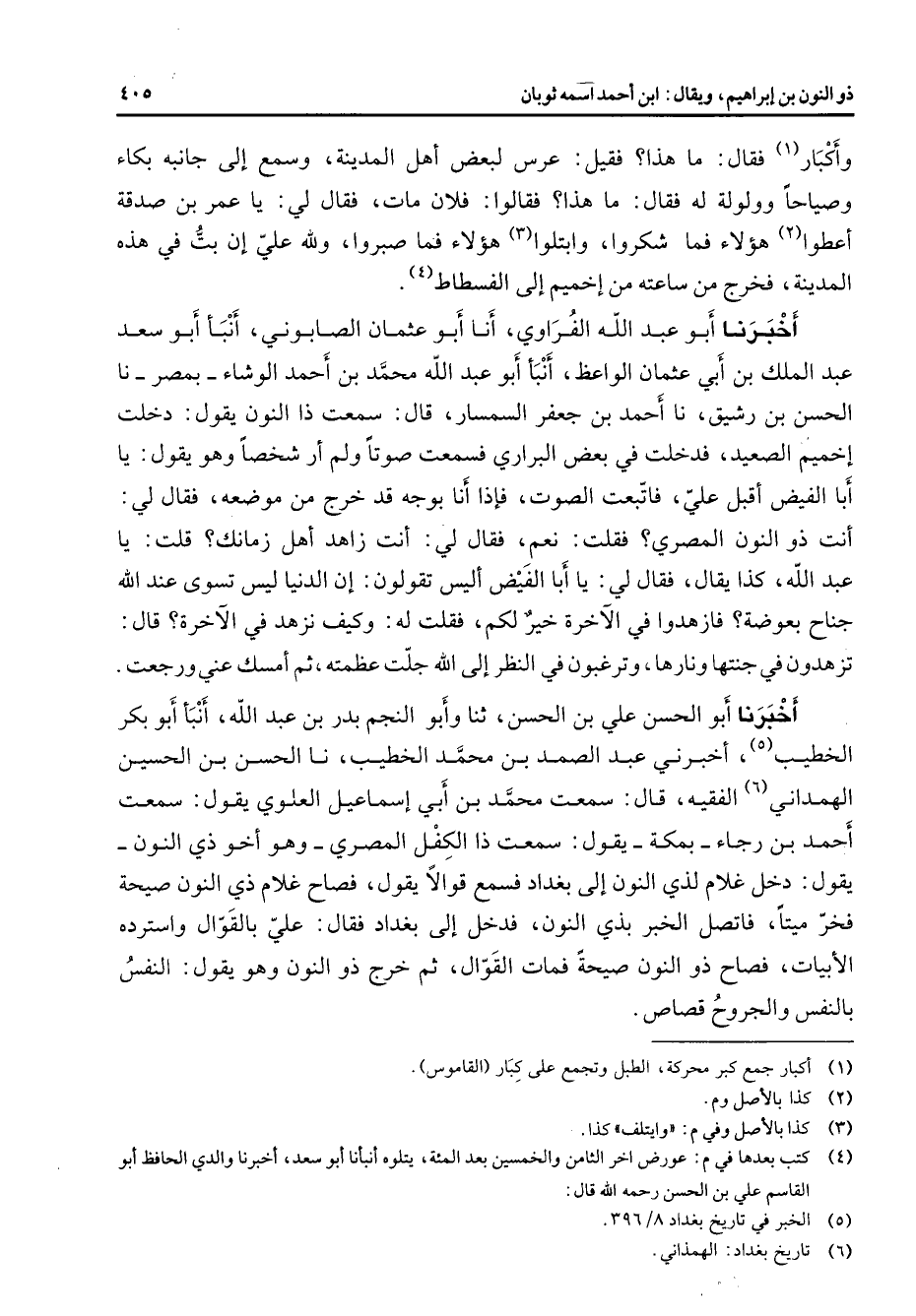 وأكبار (1) فقال ما هذا فقيل عرس لبعض أهل المدينة وسمع إلى جانبه بكاء وصياحا وولولة له فقال ما هذا فقالوا فلان مات فقال لي يا عمر بن صدقة أعطوا (2) هؤلاء فما شكروا وابتلوا (3) هؤلاء فما صبروا ولله علي إن بت في هذه المدينة فخرج من ساعته من إخميم إلى الفسطاط (4) أخبرنا أبو عبد الله الفراوي أنا أبو عثمان الصابوني أنبأ أبو سعد عبد الملك بن أبي عثمان الواعظ أنبأ أبو عبد الله محمد بن أحمد الوشاء بمصر نا الحسن بن رشيق نا أحمد بن جعفر السمسار قال سمعت ذا النون يقول دخلت إخميم الصعيد فدخلت في بعض البراري فسمعت صوتا ولم أر شخصا وهو يقول يا أبا الفيض أقبل علي فاتبعت الصوت فإذا أنا بوجه قد خرج من موضعه فقال لي أنت ذو النون المصري فقلت نعم فقال لي أنت زاهد أهل زمانك قلت يا عبد الله كذا يقال فقال لي يا أبا الفيض أليس تقولون إن الدنيا ليس تسوى عند الله جناح بعوضة فازهدوا في الآخرة خير لكم فقلت له وكيف نزهد في الآخرة قال تزهدون في جنتها ونارها وترغبون في النظر إلى الله جلت عظمته ثم أمسك عني ورجعت أخبرنا أبو الحسن علي بن الحسن ثنا وأبو النجم بدر بن عبد الله أنبأ أبو بكر الخطيب (5) أخبرني عبد الصمد بن محمد الخطيب نا الحسن بن الحسين الهمداني (6) الفقيه قال سمعت محمد بن أبي إسماعيل العلوي يقول سمعت أحمد بن رجاء بمكة يقول سمعت ذا الكفل المصري وهو أخو ذي النون يقول دخل غلام لذي النون إلى بغداد فسمع قوالا يقول فصاح غلام ذي النون صيحة فخر ميتا فاتصل الخبر بذي النون فدخل إلى بغداد فقال علي بالقوال واسترده الأبيات فصاح ذو النون صيحة فمات القوال ثم خرج ذو النون وهو يقول النفس بالنفس والجروح قصاص