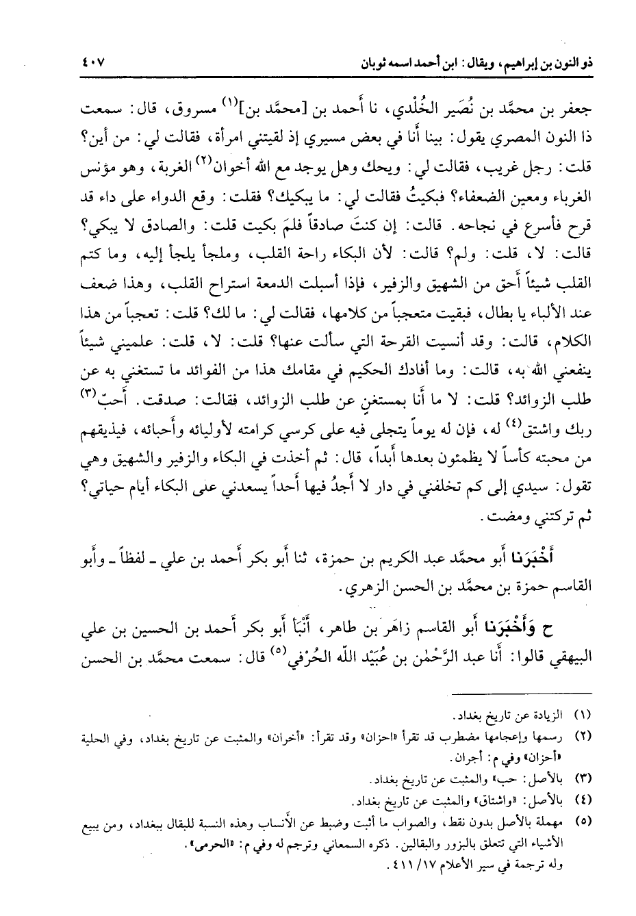جعفر بن محمد بن نصير الخلدي نا أحمد بن محمد بن (1) مسروق قال سمعت ذا النون المصري يقول بينا أنا في بعض مسيري إذ لقيتني امرأة فقالت لي من أين قلت رجل غريب فقالت لي ويحك وهل يوجد مع الله أخوان (2) الغربة وهو مؤنس الغرباء ومعين الضعفاء فبكيت فقالت لي ما يبكيك فقلت وقع الدواء على داء قد قرح فأسرع في نجاحه قالت إن كنت صادقا فلم بكيت قلت والصادق لا يبكي قالت لا قلت ولم قالت لأن البكاء راحة القلب وملجأ يلجأ إليه وما كتم القلب شيئا أحق من الشهيق والزفير فإذا أسبلت الدمعة استراح القلب وهذا ضعف عند الألباء يا بطال فبقيت متعجبا من كلامها فقالت لي مالك قلت تعجبا من هذا الكلام قالت وقد أنسيت القرحة التي سألت عنها قلت لا قلت علميني شيئا ينفعني الله به قالت وما أفادك الحكيم في مقامك هذا من الفوائد ما تستغني به عن طلب الزوائد قلت لا ما أنا بمستغن عن طلب الزوائد فقالت صدقت أحب (3) ربك واشتق (4) له فإن له يوما يتجلى فيه على كرسي كرامته لأوليائه وأحبائه فيذيقهم من محبته كأسا لا يظمئون بعدها أبدا قال ثم أخذت في البكاء والزفير والشهيق وهي تقول سيدي إلى كم تخلفني في دار أجد فيها أحدا يسعدني على البكاء أيام حياتي ثم تركتني ومضت أخبرنا أبو محمد عبد الكريم بن حمزة ثنا أبو بكر أحمد بن علي لفظا وأبو القاسم حمزة بن محمد بن الحسن الزهري ح وأخبرنا أبو القاسم زاهر بن طاهر أنبأ أبو بكر أحمد بن الحسين بن علي البيهقي قالوا أنا عبد الرحمن بن عبيد الله الحرفي (5) قال سمعت محمد بن الحسن