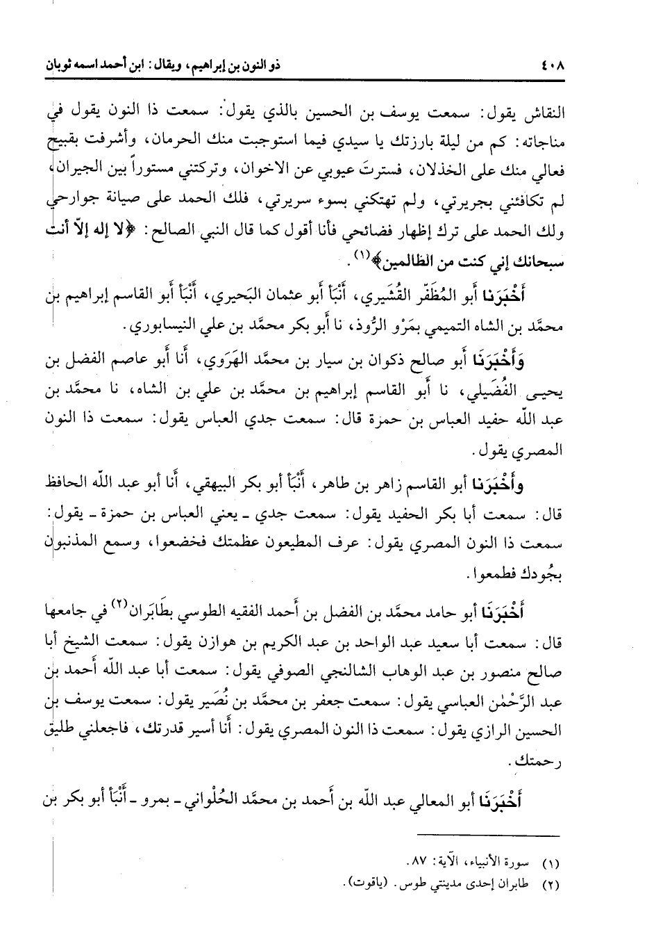 النقاش يقول سمعت يوسف بن الحسين بالذي يقول سمعت ذا النون يقول في مناجاته كم من ليلة بارزتك يا سيدي فيما استوجبت منك الحرمان وأشرفت بقبيح فعالي منك على الخذلان فسترت عيوبي عن الاخوان وتركتني مستورا بين الجيران لم تكافئني بجريرتي ولم تهتكني بسوء سريرتي فلك الحمد على صيانة جوارحي ولك الحمد على ترك إظهار فضائحي فأنا أقول كما قال النبي الصالح " لا إله إلا أنت سبحانك إني كنت من الظالمين " (1) أخبرنا أبو المظفر القشيري أنبأ أبو عثمان البحيري أنبأ أبو القاسم إبراهيم بن محمد بن الشاه التميمي بمرو الروذ نا أبو بكر محمد بن علي النيسابوري وأخبرنا أبو صالح ذكوان بن سيار بن محمد الهروي أنا أبو عاصم الفضل بن يحيى الفضيلي نا أبو القاسم إبراهيم بن محمد بن علي بن الشاه نا محمد بن عبد الله حفيد العباس بن حمزة قال سمعت جدي العباس يقول سمعت ذا النون المصري يقول وأخبرنا أبو القاسم زاهر بن طاهر أنبأ أبو بكر البيهقي أنا أبو عبد الله الحافظ قال سمعت أبا بكر الحفيد يقول سمعت جدي يعني العباس بن حمزة يقول سمعت ذا النون المصري يقول عرف المطيعون عظمتك فخضعوا وسمع المذنبون بجودك فطمعوا أخبرنا أبو حامد محمد بن الفضل بن أحمد الفقيه الطوسي بطابران (2) في جامعها قال سمعت أبا سعيد عبد الواحد بن عبد الكريم بن هوازن يقول سمعت الشيخ أبا صالح منصور بن عبد الوهاب الشالنجي الصوفي يقول سمعت أبا عبد الله أحمد بن عبد الرحمن العباسي يقول سمعت جعفر بن محمد بن نصير يقول سمعت يوسف بن الحسين الرازي يقول سمعت ذا النون المصري يقول أنا أسير قدرتك فاجعلني طليق رحمتك أخبرنا أبو المعالي عبد الله بن أحمد بن محمد الحلواني بمرو أنبأ أبو بكر بن