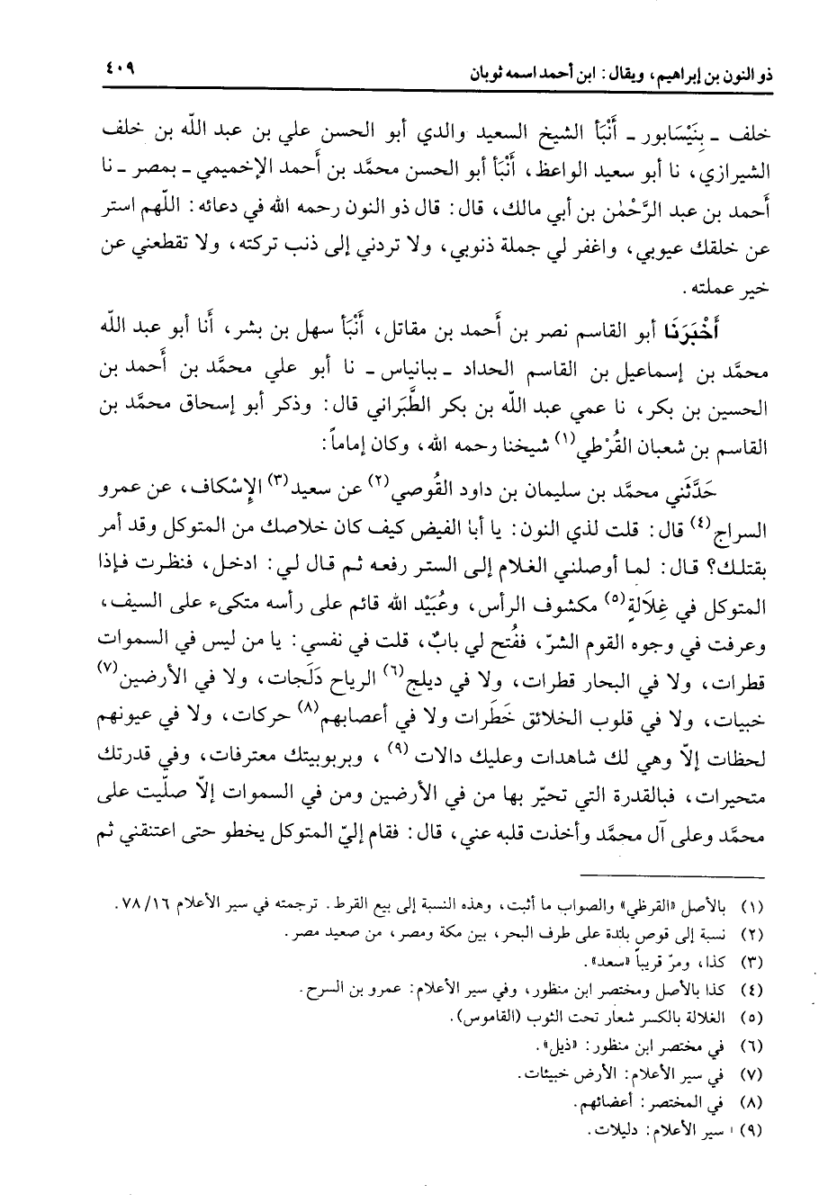 خلف بنيسابور أنبأ الشيخ السعيد والدي أبو الحسن علي بن عبد الله بن خلف الشيرازي نا أبو سعيد الواعظ أنبأ أبو الحسن محمد بن أحمد الإخميمي بمصر نا أحمد بن عبد الرحمن بن أبي مالك قال قال ذو النون رحمه الله في دعائه اللهم استر عن خلقك عيوبي واغفر لي جملة ذنوبي ولا تردني إلى ذنب تركته ولا تقطعني عن خير عملته أخبرنا أبو القاسم نصر بن أحمد بن مقاتل أنبأ سهل بن بشر أنا أبو عبد الله محمد بن إسماعيل بن القاسم الحداد ببانياس نا أبو علي محمد بن أحمد بن الحسين بن بكر نا عمي عبد الله بن بكر الطبراني قال وذكر أبو إسحاق محمد بن القاسم بن شعبان القرطي (1) شيخنا رحمه الله وكان إماما حدثني محمد بن سليمان بن داود القوصي (2) عن سعيد (3) الإسكاف عن عمرو السراج (4) قال قلت لذي النون يا أبا الفيض كيف كان خلاصك من المتوكل وقد أمر بقتلك قال لما أوصلني الغلام إلى الستر رفعه ثم قال لي ادخل فنظرت فإذا المتوكل في غلالة (5) مكشوف الرأس وعبيد الله قائم على رأسه متكئ على السيف وعرفت في وجوه القوم الشر ففتح لي باب قلت في نفسي يا من ليس في السموات قطرات ولا في البحار قطرات ولا في ديلج (6) الرياح دلجات ولا في الأرضين (7) خبيات ولا في قلوب الخلائق خطرات ولا في أعصابهم (8) حركات ولا في عيونهم لحظات إلا وهي لك شاهدات وعليك دالات (9) وبربوبيتك معترفات وفي قدرتك متحيرات فبالقدرة التي تحير بها من في الأرضين ومن في السموات إلا صليت على محمد وعلى آل محمد وأخذت قلبه عني قال فقام إلي المتوكل يخطو حتى اعتنقني ثم
