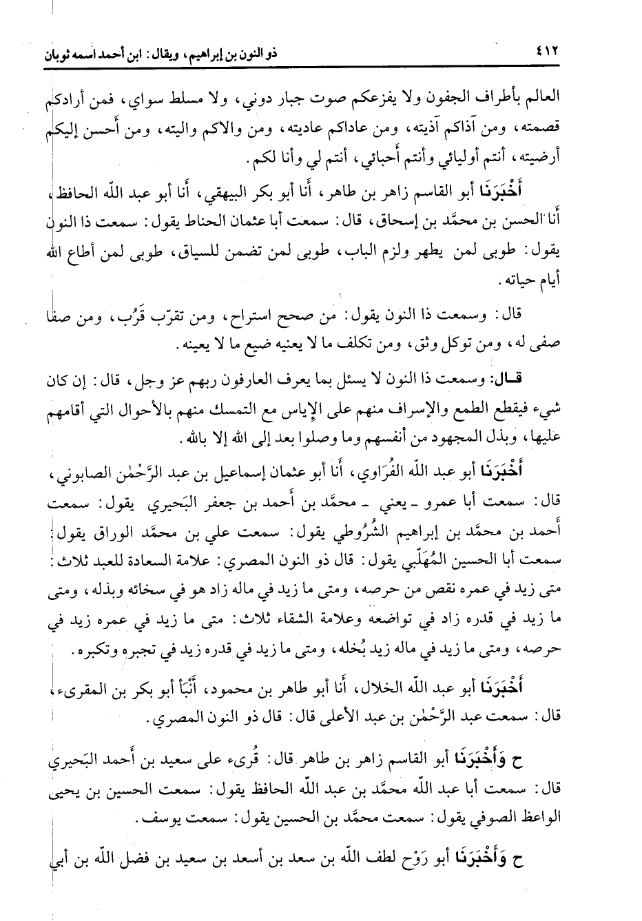 العالم بأطراف الجفون ولا يفزعكم صوت جبار دوني ولا مسلط سواي فمن أرادكم قصمته ومن آذاكم آذيته ومن عاداكم عاديته ومن والاكم واليته ومن أحسن إليكم أرضيته أنتم أوليائي وأنت أحبائي أنتم لي وأنا لكم أخبرنا أبو القاسم زاهر بن طاهر أنا أبو بكر البيهقي أنا أبو عبد الله الحافظ أنا الحسن بن محمد بن إسحاق قال سمعت أبا عثمان الحناط يقول سمعت ذا النون يقول طوبى لمن يطهر ولزم الباب طوبى لمن تضمن للسياق طوبى لمن أطاع الله أيام حياته قال وسمعت ذا النون يقول من صحح استراح ومن تقرب قرب ومن صفا صفى له ومن توكل وثق ومن تكلف ما لا يعنيه ضيع ما لا يعينه قال وسمعت ذا النون لا يسئل بما يعرف العارفون ربهم عز وجل قال إن كان شئ فيقطع الطمع والإسراف منهم على الإياس مع التمسك منهم بالأحوال التي أقامهم عليها وبذل المجهود من أنفسهم وما وصلوا بعد إلى الله إلا بالله أخبرنا أبو عبد الله الفراوي أنا أبو عثمان إسماعيل بن عبد الرحمن الصابوني قال سمعت أبا عمرو يعني محمد بن أحمد بن جعفر البحيري يقول سمعت أحمد بن محمد بن إبراهيم الشروطي يقول سمعت علي بن محمد الوراق يقول سمعت أبا الحسين المهلبي يقول قال ذو النون المصري علامة السعادة للعبد ثلاث متى زيد في عمره نقص من حرصه ومتى ما زيد في ماله زاد هو في سخائه وبذله ومتى ما زيد في قدره زاد في تواضعه وعلامة الشقاء ثلاث متى ما زيد في عمره زيد في حرصه ومتى ما زيد في ماله زيد بخله ومتى ما زيد في قدره زيد في تجبره وتكبره أخبرنا أبو عبد الله الخلال أنا أبو طاهر بن محمود أنبأ أبو بكر بن المقرئ قال سمعت عبد الرحمن بن عبد الأعلى قال قال ذو النون المصري ح وأخبرنا أبو القاسم زاهر بن طاهر قال قرئ على سعيد بن أحمد البحيري قال سمعت أبا عبد الله محمد بن عبد الله الحافظ يقول سمعت الحسين بن يحيى الواعظ الصوفي يقول سمعت محمد بن الحسين يقول سمعت يوسف ح وأخبرنا أبو روح لطف الله بن سعد بن أسعد بن سعيد بن فضل الله بن أبي