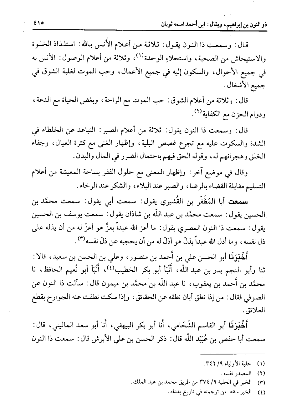 قال وسمعت ذا النون يقول ثلاثة من أعلام الأنس بالله استلذاذ الخلوة والاستيحاش من الصحبة واستحلاء الوحدة وثلاثة من أعلام الوصول الأنس به في جميع الأحوال والسكون إليه في جميع الأعمال وحب الموت لغلبة الشوق في جميع الأشغال قال وثلاثة من أعلام الشوق حب الموت مع الراحة وبغض الحياة مع الدعة ودوام الحزن مع الكفاية (2) قال وسمعت ذا النون يقول ثلاثة من أعلام الصبر التباعد عن الخلطاء في الشدة والسكوت عليه مع تجرع غصص البلية وإظهار الغنى مع كثرة العيال وجفاء الخلق وهجرانهم له وقوله الحق فيهم باحتمال الضرر في المال والبدن وقال في موضع آخر وإظهار المعنى مع حلول الفقر بساحة المعيشة من أعلام التسليم مقابلة القضاء بالرضا والصبر عند البلاء والشكر عند الرخاء سمعت أبا المظفر بن القشيري يقول سمعت أبي يقول سمعت محمد بن الحسين يقول سمعت محمد بن عبد الله بن شاذان يقول سمعت يوسف بن الحسين يقول سمعت ذا النون المصري يقول ما أعز الله عبدا بعز هو أعز له من أن يذله على ذل نفسه وما أذل الله عبدا بذل هو أذل له من أن يحجبه عن ذل نفسه (3) أخبرنا أبو الحسن علي بن أحمد بن منصور وعلي بن الحسن بن سعيد قالا ثنا وأبو النجم بدر بن عبد الله أنبأ أبو بكر الخطيب (4) أنبأ أبو نعيم الحافظ نا محمد بن أحمد بن يعقوب نا عبد الله بن محمد بن ميمون قال سألت ذا النون عن الصوفي فقال من إذا نطق أبان نطقه عن الحقائق وإذا سكت نطقت عنه الجوارح بقطع العلائق أخبرنا أبو القاسم الشحامي أنا أبو بكر البيهقي أنا أبو سعد الماليني قال سمعت أبا حفص بن عبيد الله قال ذكر الحسن بن علي الأبرش قال سمعت ذا النون