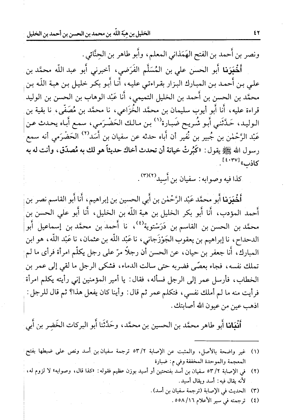 ونصر بن أحمد بن الفتح الهمذاني المعلم وابو طاهر بن الحنائي أخبرنا أبو الحسن علي بن المسلم الفرضي أخبرني أبو عبد الله محمد بن علي بن أحمد بن المبارك البزار بقراءتي عليه أنا أبو بكر خليل بن هبة الله بن محمد بن الحسن بن أحمد بن الخليل التميمي أنا عبد الوهاب بن الحسن بن الوليد قراءة عليه أنا أبو أيوب سليمان بن محمد الخزاعي نا محمد بن مصفى نا بقية بن الوليد حدثني أبو شريح ضبارة (1) بن مالك الحضرمي سمع أباه يحدث عن عبد الرحمن بن جبير بن نفير أن أباه حدثه عن سفيان بن أسد (2) الحضرمي أنه سمع رسول الله (صلى الله عليه وسلم) يقول كبرت خيانة أن تحدث أخاك حديثا هو لك به مصدق وأنت له به كاذب كذا فيه وصوابه سفيان بن أسيد (2) (3) أخبرنا أبو محمد عبد الرحمن بن أبي الحسين بن إبراهيم أنا أبو القاسم نصر بن أحمد المؤدب أنا أبو بكر الخليل بن هبة الله بن الخليل أنا أبو علي الحسن بن محمد بن الحسن بن القاسم بن درستوية (4) نا أحمد بن محمد بن إسماعيل أبو الدحداح نا إبراهيم بن يعقوب الجوزجاني نا عبد الله بن عثمان نا عبد الله هو ابن المبارك أنا جعفر بن حيان عن الحسن أن رجلا مر على رجل يكلم امرأة فرأى ما لم تملك نفسه فجاء بعصى فضربه حتى سالت الدماء فشكى الرجل ما لقي إلى عمر بن الخطاب فأرسل عمر إلى الرجل فسأله فقال يا أمير المؤمنين إني رأيته يكلم امرأة فرأيت منه ما لم أملك نفسي فتكلم عمر ثم قال وأينا كان يفعل هذا ثم قال للرجل اذهب عين من عيون الله أصابتك أنبأنا أبو طاهر محمد بن الحسين بن محمد وحدثنا أبو البركات الخضر بن أبي