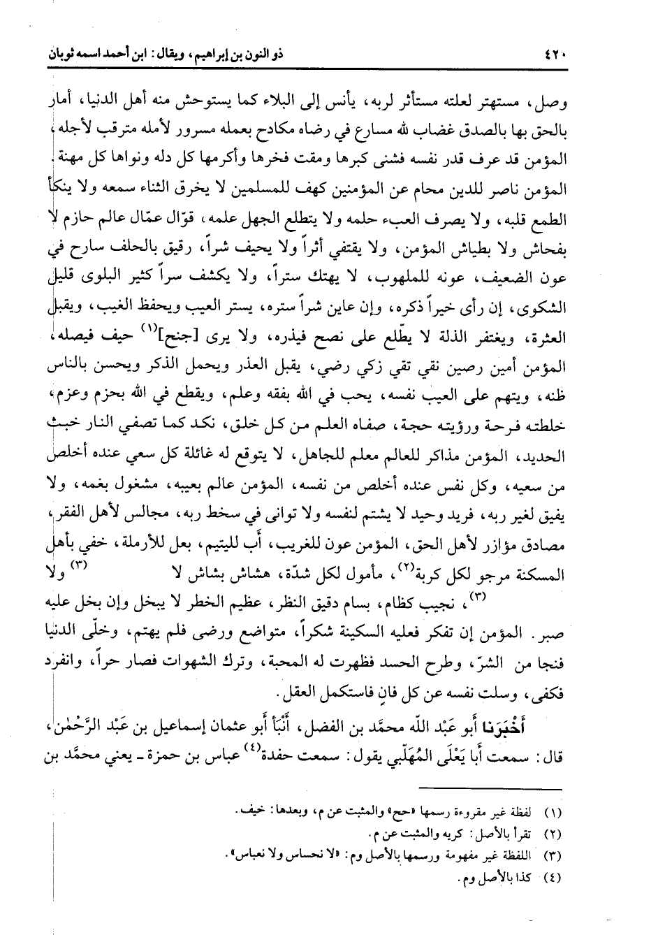 وصل مستهتر لعلته مستأثر لربه يأنس إلى البلاء كما يستوحش منه أهل الدنيا أمار بالحق بها بالصدق غضاب لله مسارع في رضاه مكادح بعمله مسرور لأمله مترقب لأجله المؤمن قد عرف قدر نفسه فشنا كبرها ومقت فخرها وأكرمها كل دله ونواها كل مهنة المؤمن ناصر للدين محام عن المؤمنين كهف للمسلمين لا يخرق الثناء سمعه ولا ينكأ الطمع قلبه ولا يصرف العبء حلمه ولا يتطلع الجهل علمه قوال عمال عالم حازم لا بفحاش ولا بطياش المؤمن ولا يقتفي أثرا ولا يحيف شرا رقيق بالحلف سارح في عون الضعيف عونه للملهوب لا يهتك سترا ولا يكشف سرا كثير البلوى قليل الشكوى إن رأى خيرا ذكره وإن عاين شرا ستره يستر العيب ويحفظ الغيب ويقبل العثرة ويغتفر الذلة لا يطلع على نصح فيذره ولا يرى جنح (1) حيف فيصله المؤمن أمين رصين نقي تقي زكي رضي يقبل العذر ويحمل الذكر ويحسن بالناس ظنه ويتهم على العيب نفسه يحب في الله بفقه وعلم ويقطع في الله بحزم وعزم خلطته فرحة ورؤيته حجة صفاه العلم من كل خلق نكد كما تصفي النار خبث الحديد المؤمن مذاكر للعالم معلم للجاهل لا يتوقع له غائلة كل سعي عنده أخلص من سعيه وكل نفس عنده أخلص من نفسه المؤمن عالم بعيبه مشغول بغمه ولا يفيق لغير ربه فريد وحيد لا يشتم لنفسه ولا توانى في سخط ربه مجالس لأهل الفقر مصادق مؤازر لأهل الحق المؤمن عون للغريب أب لليتيم بعل للأرملة خفي بأهل المسكنة مرجو لكل كربة (2) مأمول لكل شدة هشاش بشاش لا (3) ولا نجيب كظام بسام دقيق النظر عظيم الخطر لا يبخل وإن بخل عليه صبر المؤمن إن تفكر فعليه السكينة شكرا متواضع ورضى فلم يهتم وخلى الدنيا فنجا من الشر وطرح الحسد فظهرت له المحبة وترك الشهوات فصار حرا وانفرد فكفى وسلة نفسه عن كل فان فاستكمل العقل أخبرنا أبو عبد الله محمد بن الفضل أنبأ أبو عثمان إسماعيل بن عبد الرحمن قال سمعت أبا يعلى المهلبي يقول سمعت حفدة (4) عباس بن حمزة يعني محمد بن
