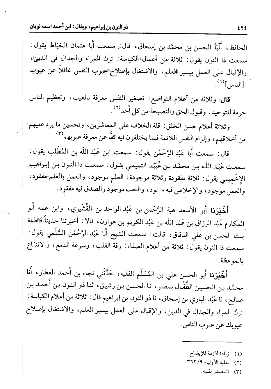 الحافظ أنبأ الحسن بن محمد بن إسحاق قال سمعت أبا عثمان الخياط يقول سمعت ذا النون يقول ثلاثة من أعمال الكياسة ترك المراء والجدال في الدين والإقبال على العمل بيسير العلم والاشتغال بإصلاح عيوب النفس غافلا عن عيوب الناس (1) قال وثلاثة من أعلام التواضع تصغير النفس معرفة بالعيب وتعظيم الناس حرمة للتوحيد وقبول الحق والنصيحة من كل أحد (2) وثلاثة أعلام حسن الخلق قله الخلاف على المعاشرين وتحسين ما يرد عليهم من أخلاقهم وإلزام النفس اللائمة فما يختلفون فيه كفا عن معرفة عيوبهم (3) قال سمعت أبا عبد الرحمن يقول سمعت ابن عبد الله بن المطلب يقول سمعت عبد الله بن محمد بن عبيد التميمي يقول سمعت ذا النون بن إبراهيم الإخميمي يقول ثلاثة مفقودة وثلاثة موجودة العلم موجود والعلم بالعلم مفقود والعمل موجود والإخلاص فيه مفقود والحب موجود والصدق فيه مفقود أخبرنا أبو الأسعد هبة الرحمن بن عبد الواحد بن القشيري وابن عمه أبو المكارم عبد الرازق بن عبد الله بن عبد الكريم بن هوازن قالا أخبرتنا حديثا فاطمة بنت الحسن بن علي الدقاق قالت سمعت الشيخ أبا عبد الرحمن السلمي يقول سمعت ذا النون يقول ثلاثة من أعلام الصفاء رقة القلب وسرعة الدمع والانتفاع بالموعظة أخبرنا أبو الحسن علي بن المسلم الفقيه حدثني نجاء بن أحمد العطار أنا محمد بن الحسين الطفال بمصر نا الحسن بن رشيق ثنا ذو النون بن أحمد بن صالح نا عبد الباري بن إسحاق نا ذو النون بن إبراهيم قال ثلاثة من أعلام الكياسة ترك المراء والجدال في الدين والإقبال على العمل بيسير العلم والاشتغال بإصلاح عيوبك عن عيوب الناس