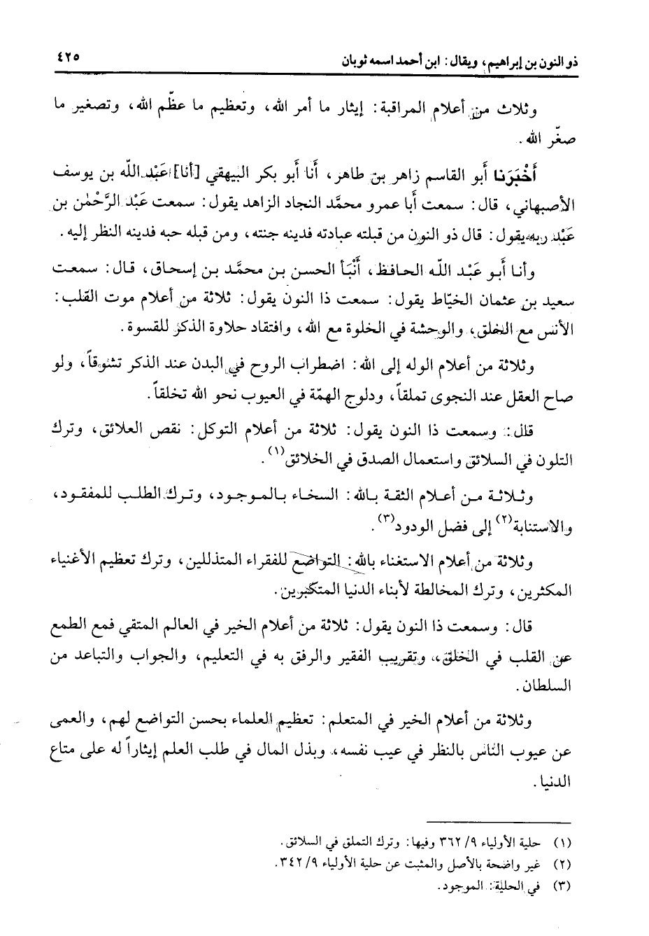 وثلاث من أعلام المراقبة إيثار ما أمر الله وتعظيم ما عظم الله وتصغير ما صغر الله أخبرنا أبو القاسم زاهر بن طاهر أنا أبو بكر البيهقي أنا عبد الله بن يوسف الأصبهاني قال سمعت أبا عمرو محمد النجاد الزاهد يقول سمعت عبد الرحمن بن عبد ربه يقول قال ذو النون من قبلته عبادته فدينه جنته ومن قبله حبه فدينه النظر إليه وأنا أبو عبد الله الحافظ أنبأ الحسن بن محمد بن إسحاق قال سمعت سعيد بن عثمان الخياط يقول سمعت ذا النون يقول ثلاثة من أعلام موت القلب الأنس مع الخلق والوحشة في الخلوة مع الله وافتقاد حلاوة الذكر للقسوة وثلاثة من أعلام الوله إلى الله اضطراب الروح في البدن عند الذكر تشوقا ولو صاح العقل عند النجوى تملقا ودلوج الهمة في العيوب نحو الله تخلقا قال وسمعت ذا النون يقول ثلاثة من أعلام التوكل نقص العلائق وترك التلون في السلائق واستعمال الصدق في الخلائق (1) وثلاثة من أعلام الثقة بالله السخاء بالموجود وترك الطلب للمفقود والاستنابة (2) إلى فضل الودود (3) وثلاثة من أعلام الاستغناء بالله التواضع للفقراء المتذللين وترك تعظيم الأغنياء المكثرين وترك المخالطة لأبناء الدنيا المتكبرين قال وسمعت ذا النون يقول ثلاثة من أعلام الخير في العالم المتقي فمع الطمع عن القلب في الخلق وتقريب الفقير والرفق به في التعليم والجواب والتباعد من السلطان وثلاثة من أعلام الخير في المتعلم تعظيم العلماء بحسن التواضع لهم والعمى عن عيوب الناس بالنظر في عيب نفسه وبذل المال في طلب العلم إيثارا له على متاع الدنيا
