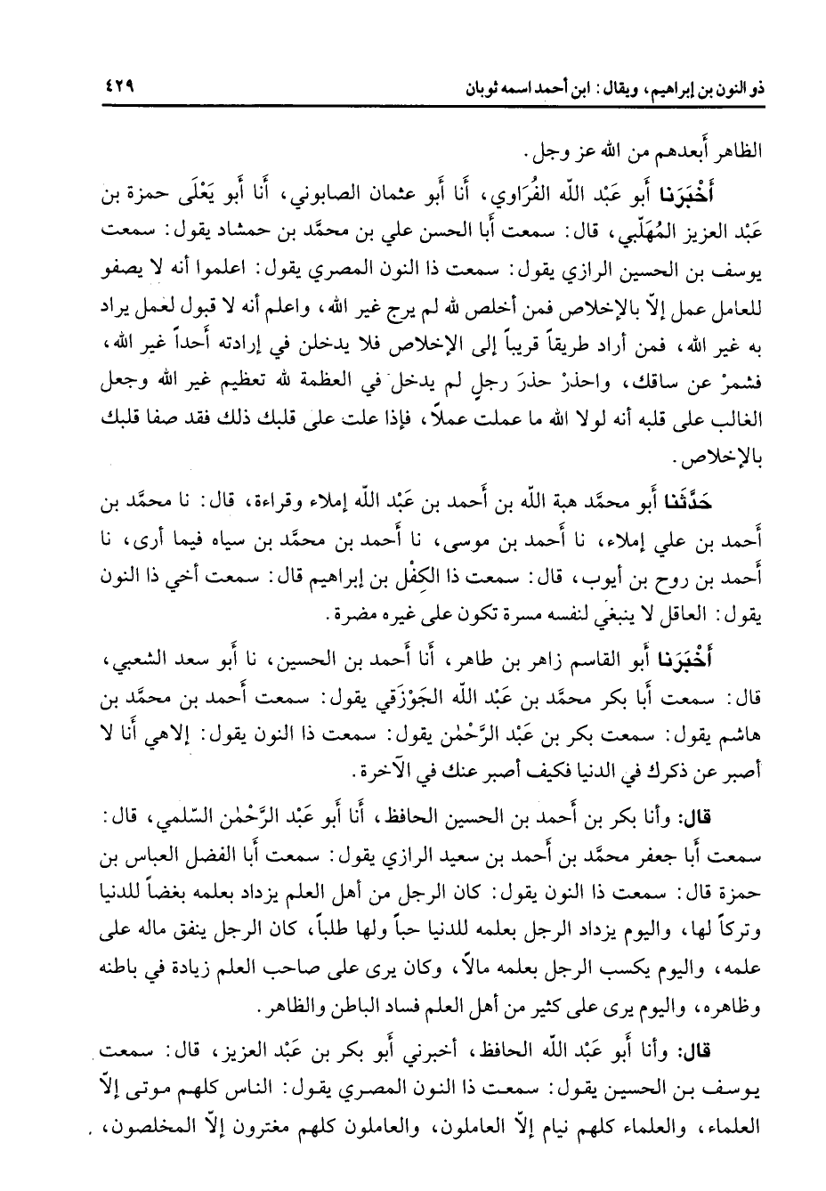 الظاهر أبعدهم من الله عز وجل أخبرنا أبو عبد الله الفراوي أنا أبو عثمان الصابوني أنا أبو يعلى حمزة بن عبد العزيز المهلبي قال سمعت أبا الحسن علي بن محمد بن حمشاد يقول سمعت يوسف بن الحسين الرازي يقول سمعت ذا النون المصري يقول اعلموا أنه لا يصفو للعامل عمل إلا بالإخلاص فمن أخلص لله لم يرج غير الله واعلم أنه لا قبول لعمل يراد به غير الله فمن أراد طريقا قريبا إلى الإخلاص فلا يدخلن في إرادته أحدا غير الله فشمر عن ساقك واحذر حذر رجل لم يدخل في العظمة لله تعظيم غير الله وجعل الغالب على قلبه أنه لولا الله ما عملت عملا فإذا علت على قلبك ذلك فقد صفا لقلبك بالإخلاص حدثنا أبو محمد هبة الله بن أحمد بن عبد الله إملاء وقراءة قال نا محمد بن أحمد بن علي إملاء نا أحمد بن موسى نا أحمد بن محمد بن سياه فيما أرى نا أحمد بن روح بن أيوب قال سمعت ذا الكفل بن إبراهيم قال سمعت أخي ذا النون يقول العاقل لا ينبغي لنفسه مسرة تكون على غيره مضرة أخبرنا أبو القاسم زاهر بن طاهر أنا أحمد بن الحسين نا أبو سعد الشعبي قال سمعت أبا بكر محمد بن عبد الله الجوزقي يقول سمعت أحمد بن محمد بن هاشم يقول سمعت بكر بن عبد الرحمن يقول سمعت ذا النون يقول إلاهي أنا لا أصبر عن ذكرك في الدنيا فكيف أصبر عنك في الآخرة قال وأنا بكر بن أحمد بن الحسين الحافظ أنا أبو عبد الرحمن السلمي قال سمعت أبا جعفر محمد بن أحمد بن سعيد الرازي يقول سمعت أبا الفضل العباس بن حمزة قال سمعت ذا النون يقول كان الرجل من أهل العلم يزداد بعلمه بغضا للدنيا وتركا لها واليوم يزداد الرجل بعلمه للدنيا حبا ولها طلبا كان الرجل ينفق ماله على