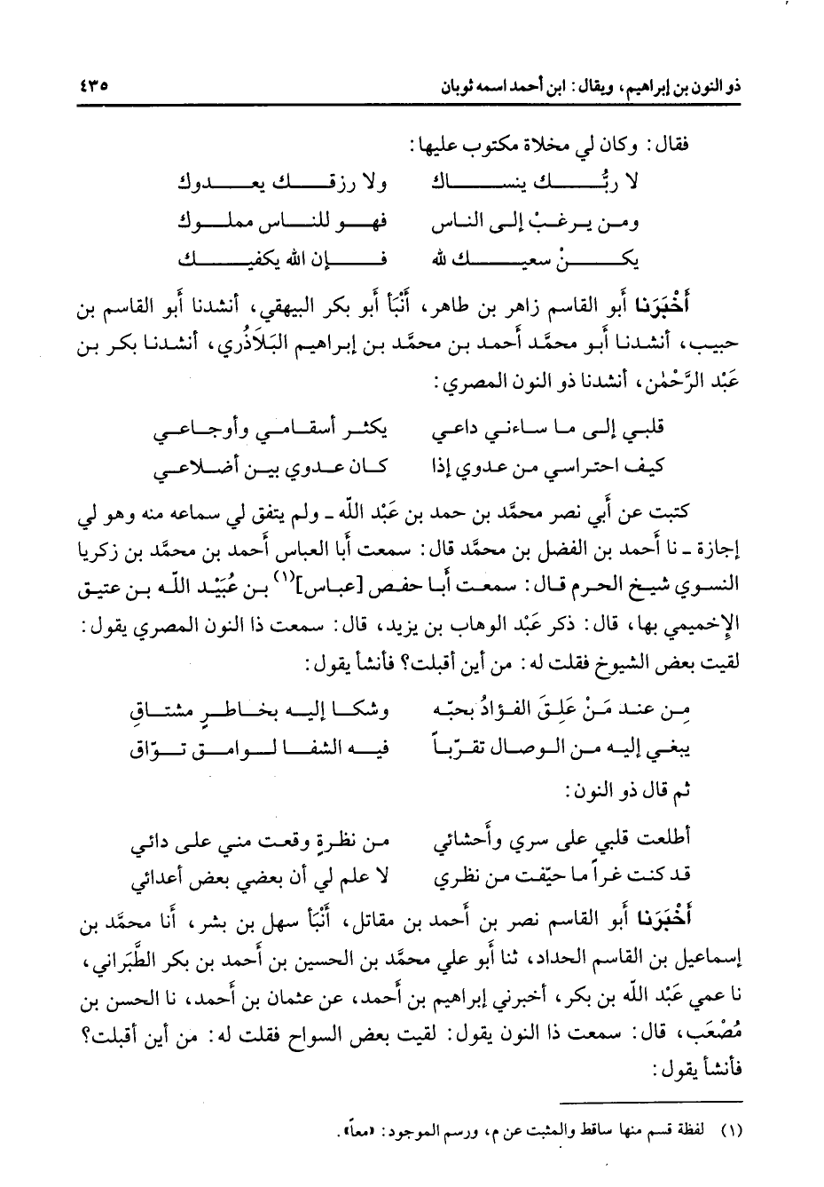 فقال وكان لي مخلاة مكتوب عليها * لا ربك ينساك * ولا رزقك يعدوك ومن يرغب إلي الناس * فهو للناس مملوك يكن سعيك لله * فإن الله يكفيك * أخبرنا أبو القاسم زاهر بن طاهر أنبأ أبو بكر البيهقي أنشدنا أبو القاسم بن حبيب أنشدنا أبو محمد أحمد بن محمد بن إبراهيم البلاذري أنشدنا بكر بن عبد الرحمن أنشدنا ذو النون المصري قلبي إلى ما ساءني داعي * يكثر أسقامي وأوجاعي كيف احتراسي من عدوي إذا * كان عدوي بين أضلاعي * كتبت عن أبي نصر محمد بن حمد بن عبد الله ولم يتفق لي سماعه منه وهو لي إجازة نا أحمد بن الفضل بن محمد قال سمعت أبا العباس أحمد بن محمد بن زكريا النسوي شيخ الحرم قال سمعت أبا حفص عباس (1) بن عبيد الله بن عتيق الإخميمي بها قال ذكر عبد الوهاب بن يزيد قال سمعت ذا النون المصري يقول لقيت بعض الشيوخ فقلت له من أين أقبلت فأنشأ يقول من عند من علق الفؤاد بحبه * وشكا إليه بخاطر مشتاق يبغي إليه من الوصال تقربا * فيه الشفا لوامق تواق * ثم قال ذو النون أطلعت قلبي على سري وأحشائي * من نظرة وقعت مني على دائي قد كنت غرا ما حيفت من نظري * لا علم لي أن بعضي بعض أعدائي * أخبرنا أبو القاسم نصر بن أحمد بن مقاتل أنبأ سهل بن بشر أنا محمد بن إسماعيل بن القاسم الحداد ثنا أبو علي محمد بن الحسين بن أحمد بن بكر الطبراني نا عمي عبد الله بن بكر أخبرني إبراهيم بن أحمد عن عثمان بن أحمد نا الحسن بن مصعب قال سمعت ذا النون يقول لقيت بعض السواح فقلت له من أين أقبلت فأنشأ يقول
