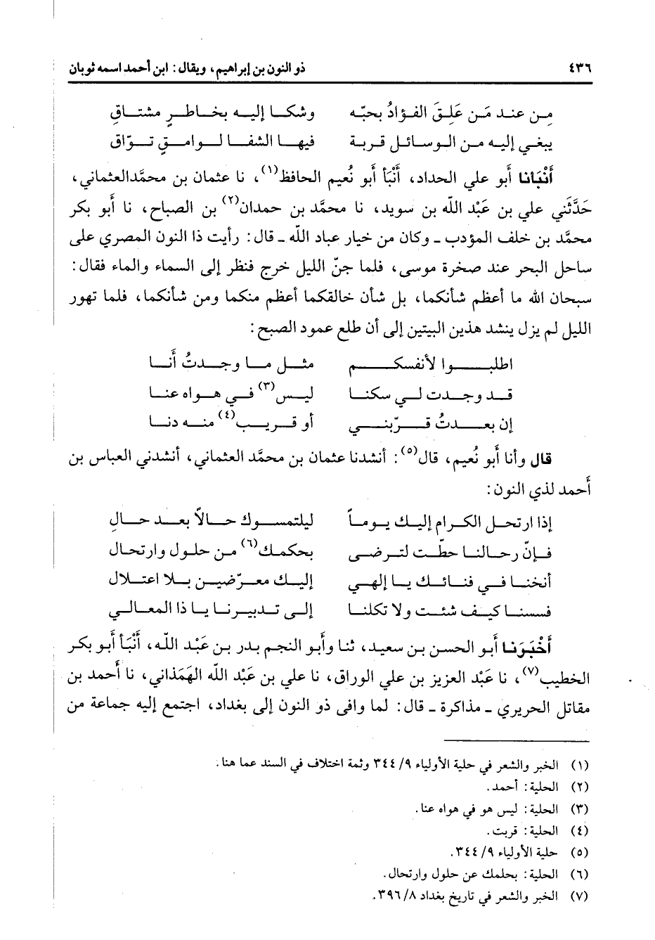 * من عند من علق الفؤاد بحبه * وشكا إليه بخاطر مشتاق يبغي إليه من الوسائل قربة * فيها الشفا لوامق تواق * أنبأنا أبو علي الحداد أنبأ أبو نعيم الحافظ (1) نا عثمان بن محمد العثماني حدثني علي بن عبد الله بن سويد نا محمد بن حمدان (2) بن الصباح نا أبو بكر محمد بن خلف المؤدب وكان من خيار عباد الله قال رأيت ذا النون المصري على ساحل البحر عند صخرة موسى فلما جن الليل خرج فنظر إلى السماء والماء فقال سبحان الله ما أعظم شأنكما بل شأن خالقكما أعظم منكما ومن شأنكما فلما تهور الليل لم يزل ينشد هذين البيتين إلى أن طلع عمود الصبح اطلبوا لأنفسكم * مثل ما وجدت أنا قد وجدت لي سكنا * ليس (3) في هواه عنا إن بعدت قربني * أو قريب (4) منه دنا * قال وأنا أبو نعيم قال (5) أنشدنا عثمان بن محمد العثماني أنشدني العباس بن أحمد لذي النون * إذا ارتحل الكرام إليك يوما * ليلتمسوك حالا بعد حال فإن رحالنا حطت لترضى * بحكمك (6) من حلول وارتحال أنخنا في فنائك يا إلهي * إليك معرضين بلا اعتلال فسسنا كيف شئت ولا تكلنا * إلى تدبيرنا يا ذا المعالي * أخبرنا أبو الحسن بن سعيد ثنا وأبو النجم بدر بن عبد الله أنبأ أبو بكر الخطيب (7) نا عبد العزيز بن علي الوراق نا علي بن عبد الله الهمذاني نا أحمد بن مقاتل الحريري مذاكرة قال لما وافى ذو النون إلى بغداد اجتمع إليه جماعة من