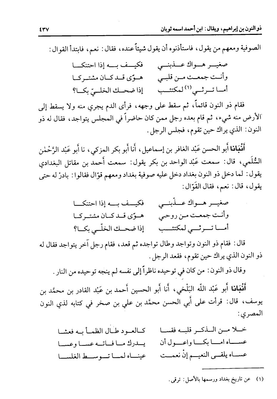 الصوفية ومعهم من يقول فاستأذنوه أن يقول شيئا عنده فقال نعم فابتدأ القوال صغير هواك عذبني * فكيف به إذا احتنكا وأنت جمعت من قلبي * هوى قد كان مشتركا أما ترثي (1) لمكتئب * إذا ضحك الخلي بكا * فقام ذو النون قائما ثم سقط على وجهه فرأى الدم يجري منه ولا يسقط إلى الأرض منه شئ ثم قام بعده رجل ممن كان حاضرا في المجلس يتواجد فقال له ذو النون الذي يراك حين تقوم فجلس الرجل أنبأنا أبو الحسن عبد الغافر بن إسماعيل أنا أبو بكر المزكي نا أبو عبد الرحمن السلمي قال سمعت عبد الواحد بن بكر يقول سمعت أحمد بن مقاتل البغدادي يقول لما دخل ذو النون بغداد دخل عليه صوفية بغداد ومعهم قوال فقالوا بادر له حتى يقول قال نعم فقال القوال صغير هواك عذبني * فكيف به إذا احتنكا وأنت جمعت من روحي * هوى قد كان مشتركا أما ترثي لمكتئب * إذا ضحك الخلي بكا * قال فقام ذو النون وتواجد وطال تواجده ثم قعد فقام رجل آخر يتواجد فقال له ذو النون الذي يراك حين تقوم فقعد الرجل وقال ذو النون من كان في توحيده ناظرا إلى نفسه لم ينجه توحيده من النار أنبأنا أبو عبد الله البلخي أنا أبو الحسين أحمد بن عبد القادر بن محمد بن يوسف قال قرأت على أبي الحسن محمد بن علي بن صخر في كتابه لذي النون المصري خلا من الذكر قلبه فقسا * كالعود طال الظمأ به فعشا عساه أما بكا واعول أن * يدرك ما فاته عسا وعسا عساه يلقى النعيم إن نعمت * عيناه لما توسط الغلسا