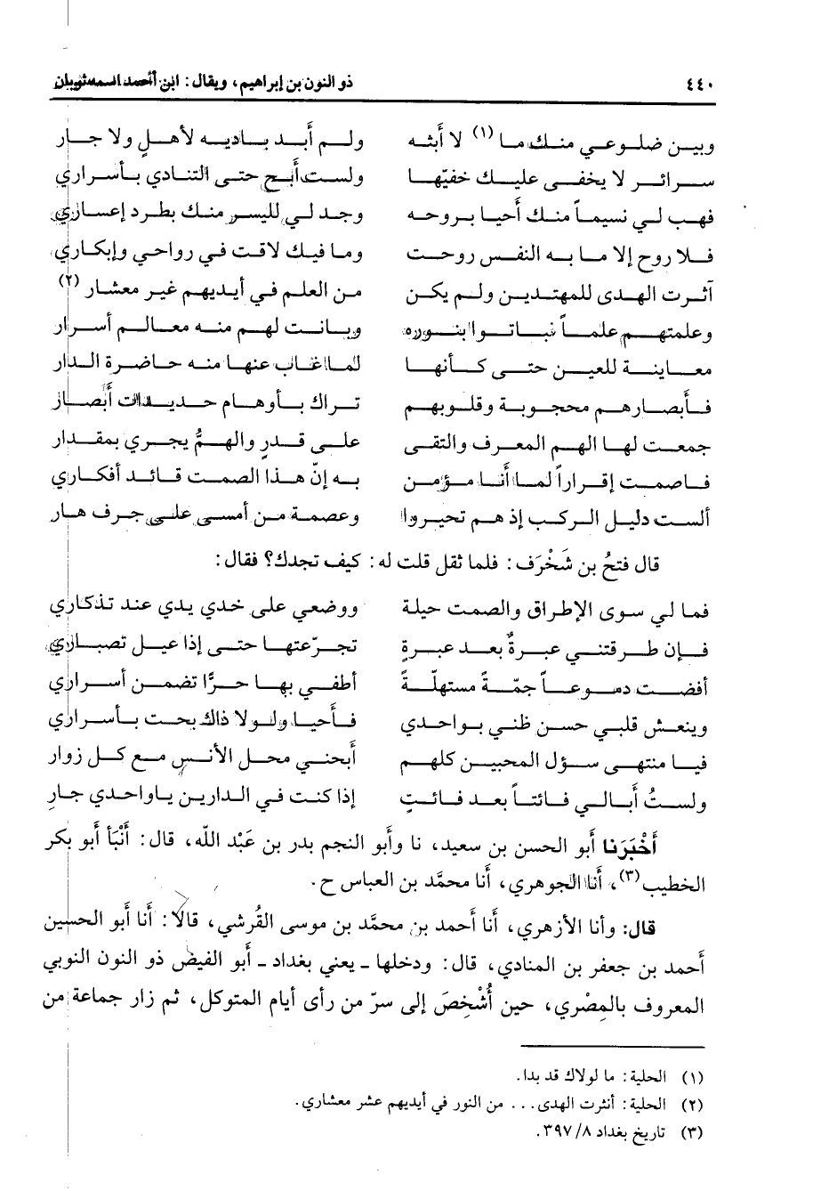 وبين ضلوعي منك ما (1) لا أبثه * ولم أبد باديه لأهل ولا جار سرائر لا يخفى عليك خفيها * ولست أبح حتى التنادي بأسراري فهب لي نسيما منك أحيا بروحه * وجد لي لليسر منك بطرد إعساري فلا روح إلا ما به النفس روحت * وما فيك لاقت في رواحي وإبكاري آثرت الهدى للمهتدين ولم يكن * من العلم في أيديهم غير معشار (2) وعلمتهم علما فباتوا بنوره * وبانت لهم منه معالم أسرار معاينة للعين حتى كأنها * لما غاب عنها منه حاضرة الدار فأبصارهم محجوبة وقلوبهم * تراك بأوهام حديدات أبصار جمعت لها الهم المعرف والتقى * على قدر والهم يجري بمقدار فاصمت إقرارا لما أنا مؤمن * به إن هذا الصمت قائد أفكاري ألست دليل الركب إذ هم تحيروا * وعصمة من أمسى على جرف هار * قال فتح بن شخرف فلما ثقل قلت له كيف تجدك فقال فما لي سوى الإطراق والصمت حيلة * ووضعي على خدي يدي عند تذكاري فإن طرقتني عبرة بعد عبرة * تجرعتها حتى إذا عيل تصباري أفضت دموعا جمة مستهلة * أطفي بها حرا تضمن أسراري وينعش قلبي حسن ظني بواحدي * فأحيا ولولا ذاك بحت بأسراري فيا منتهى سؤل المحبين كلهم * أبحني محل الأنس مع كل زوار ولست أبالي فائتا بعد فائت * إذا كنت في الدارين يا واحدي جار * أخبرنا أبو الحسن بن سعيد نا وأبو النجم بدر بن عبد الله قال أنبأ أبو بكر الخطيب (3) أنا الجوهري أنا محمد بن العباس قال وأنا الأزهري أنا أحمد بن محمد بن موسى القرشي قالا أنا أبو الحسين أحمد بن جعفر بن المنادي قال ودخلها يعني بغداد أبو الفيض ذو النون النوبي المعروف بالمصري حين أشخص إلى سر من رأى أيام المتوكل ثم زار جماعة من