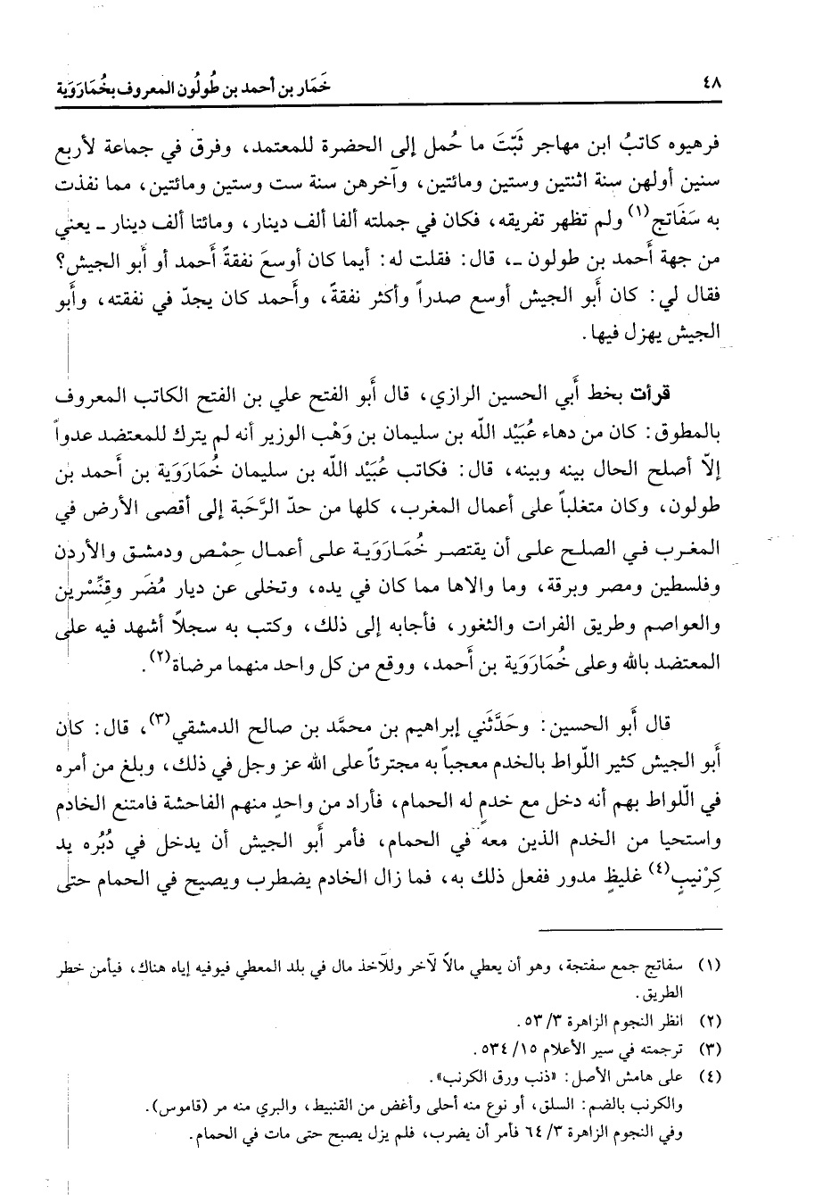 فرهيوه كاتب ابن مهاجر ثبت ما حمل إلى الحضرة للمعتمد وفرق في جماعة لأربع سنين أولهن سنة اثنتين وستين ومائتين وآخرهن سنة ست وستين ومائتين مما نفذت به سفاتج (1) ولم تظهر تفريقه فكان في جملته ألفا ألف دينار ومائتا ألف دينار يعني من جهة أحمد بن طولون قال فقلت له أيما كان أوسع نفقة أحمد أو أبو الجيش فقال لي كان أبو الجيش أوسع صدرا وأكثر نفقة وأحمد كان يجد في نفقته وأبو الجيش يهزل فيها قرأت بخط أبي الحسين الرازي قال أبو الفتح علي بن الفتح الكاتب المعروف بالمطوق كان من دهاء عبيد الله بن سليمان بن وهب الوزير أنه لم يترك للمعتضد عدوا إلا أصلح الحال بينه وبينه قال فكاتب عبيد الله بن سليمان خماروية بن أحمد بن طولون وكان متغلبا على أعمال المغرب كلها من حد الرحبة إلى أقصى الأرض في المغرب في الصلح على أن يقتصر خماروية على أعمال حمص ودمشق والأردن وفلسطين ومصر وبرقة وما والاها مما كان في يده وتخلى عن ديار مضر وقنسرين والعواصم وطريق الفرات والثغور فأجابه إلى ذلك وكتب به سجلا أشهد فيه على المعتضد بالله وعلى خماروية بن أحمد ووقع من كل واحد منهما مرضاة (2) قال أبو الحسين وحدثني إبراهيم بن محمد بن صالح الدمشقي (3) قال كان أبو الجيش كثير اللواط بالخدم معجبا به مجترئا على الله عز وجل في ذلك وبلغ من أمره في اللواط بهم أنه دخل مع خدم له الحمام فأراد من واحد منهم الفاحشة فامتنع الخادم واستحيا من الخدم الذين معه في الحمام فأمر أبو الجيش أن يدخل في دبره يد كرنيب (4) غليظ مدور ففعل ذلك به فما زال الخادم يضطرب ويصيح في الحمام حتى