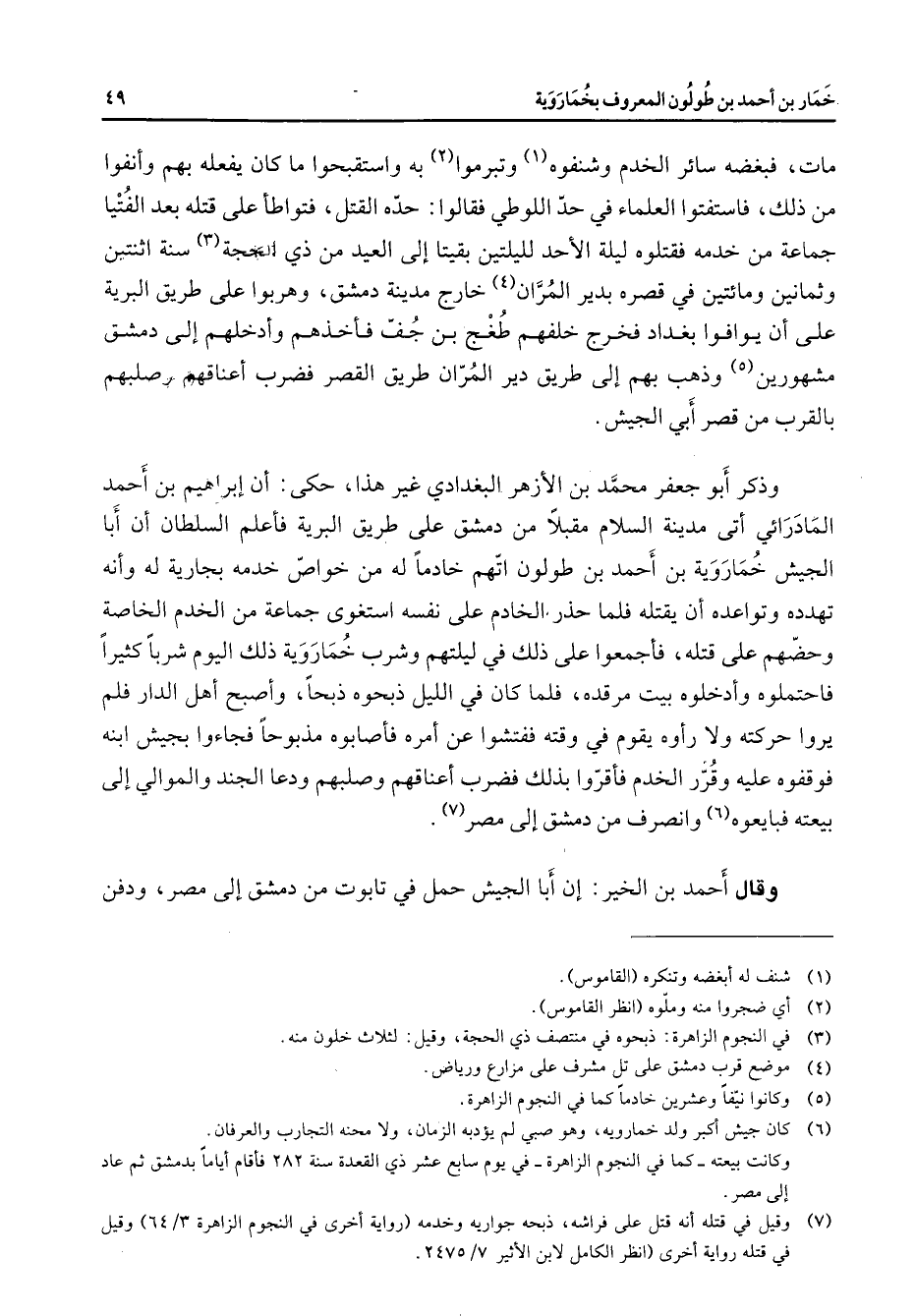 (7) وقيل في قتله أنه قتل على فراشه ذبحه جواريه وخدمه (ورواية أخخرى في النجوم الزاهرة 3 / 64) وقيل في قتله رواية أخرى (انظر الكامل لابن الاثير 7 / 3475