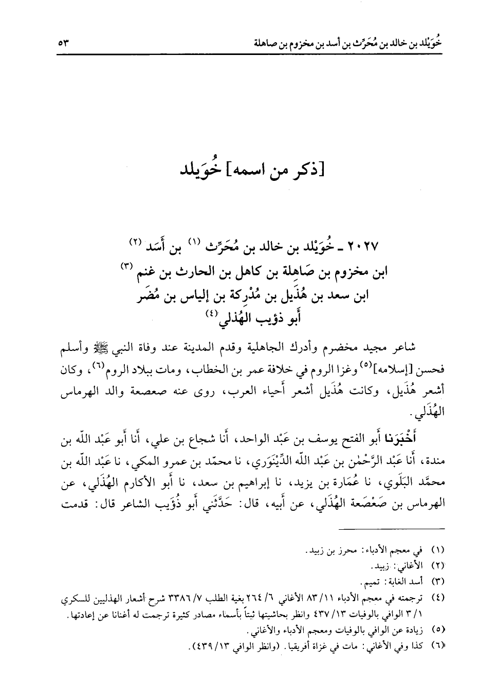2027 - خويلد بن خالد بن محرث (1) بن أسد (2) ابن مخزوم بن صاهلة بن كاهل بن الحارث بن غنم (3) ابن سعد بن هذيل بن مدركة بن إلياس بن مضر أبو ذؤيب الهذلي (3) شاعر مجيد مخضرم وأدرك الجاهلية وقدم المدينة عند وفاة النبي (صلى الله عليه وسلم) وأسلم فحسن إسلامه (5) وغزا الروم في خلافة عمر بن الخطاب ومات ببلاد الروم (6) وكان أشعر هذيل وكانت هذيل أشعر أحياء العرب روى عنه صعصعة والد الهرماس الهذلي أخبرنا أبو الفتح يوسف بن عبد الواحد أنا شجاع بن علي أنا أبو عبد الله بن مندة أنا عبد الرحمن بن عبد الله الدينوري نا محمد بن عمرو المكي نا عبد الله بن محمد البلوي نا عمارة بن يزيد نا إبراهيم بن سعد نا أبو الأكارم الهذلي عن ح الهرماس بن صعصعة الهذلي عن أبيه قال حدثني أبو ذؤيب الشاعر قال قدمت