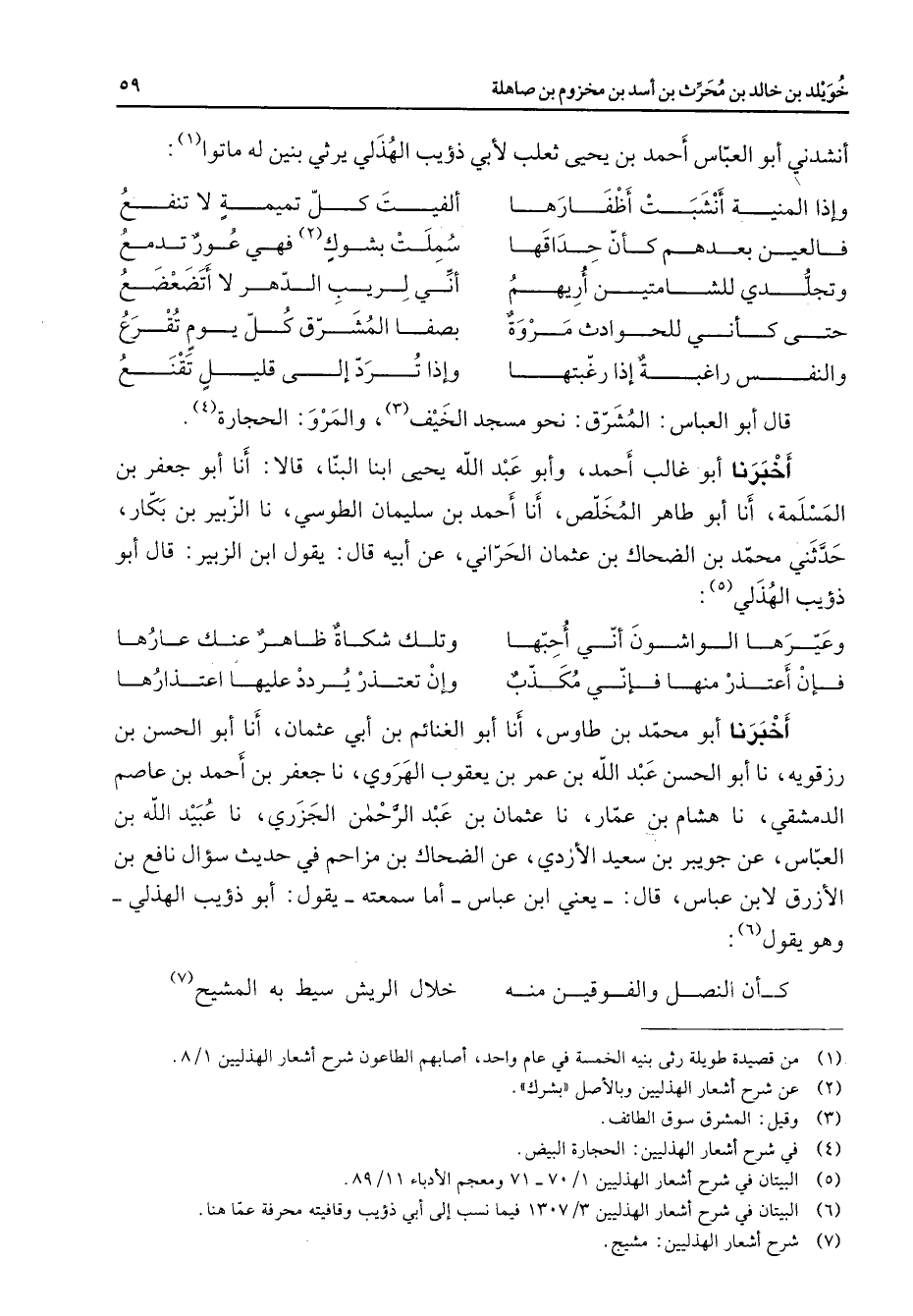 أنشدني أبو العباس أحمد بن يحيى ثعلب لأبي ذؤيب الهذلي يرثي بنين له ماتوا * وإذا المنية أنشبت أظفارها * ألفيت كل تميمة لا تنقع فالعين بعدهم كأن حداقها * سملت بشوك (2) فهي عور تدمع وتجلدي للشامتين أريهم * أني لريب الدهر لا أتضعضع حتى كأني للحوادث مروة * بصفا المشرق كل يوم تقرع والنفس راغبة إذا رغبتها * وإذا ترد إلى قليل تقنع * قال أبو العباس المشرق نحو مسجد الخيف (3) والمرو الحجارة (4) أخبرنا أبو غالب أحمد وأبو عبد الله يحيى ابنا البنا قالا أنا أبو جعفر بن المسلمة أنا أبو طاهر المخلص أنا أحمد بن سليمان الطوسي نا الزبير بن بكار حدثني محمد بن الضحاك بن عثمان الحراني عن أبيه قال يقول ابن الزبير قال أبو ذؤيب الهذلي (5) * وعيرها الواشون أني أحبها * وتلك شكاة ظاهر عنك عارها فإن أعتذر منها فإني مكذب * وإن تعتذر يردد عليها اعتذارها * أخبرنا أبو محمد بن طاوس أنا أبو الغنائم بن أبي عثمان أنا أبو الحسن بن رزقويه نا أبو الحسن عبد الله بن عمر بن يعقوب الهروي نا جعفر بن أحمد بن عاصم الدمشقي نا هشام بن عمار نا عثمان بن عبد الرحمن الجزري نا عبيد الله بن العباس عن جويبر بن سعيد الأزدي عن الضحاك بن مزاحم في حديث سؤال نافع بن الأزرق لابن عباس قال يعني ابن عباس أما سمعته يقول أبو ذؤيب الهذلي وهو يقول (6) * كأن النصل والفوقين منه * خلال الريش سيط به المشيح (7)