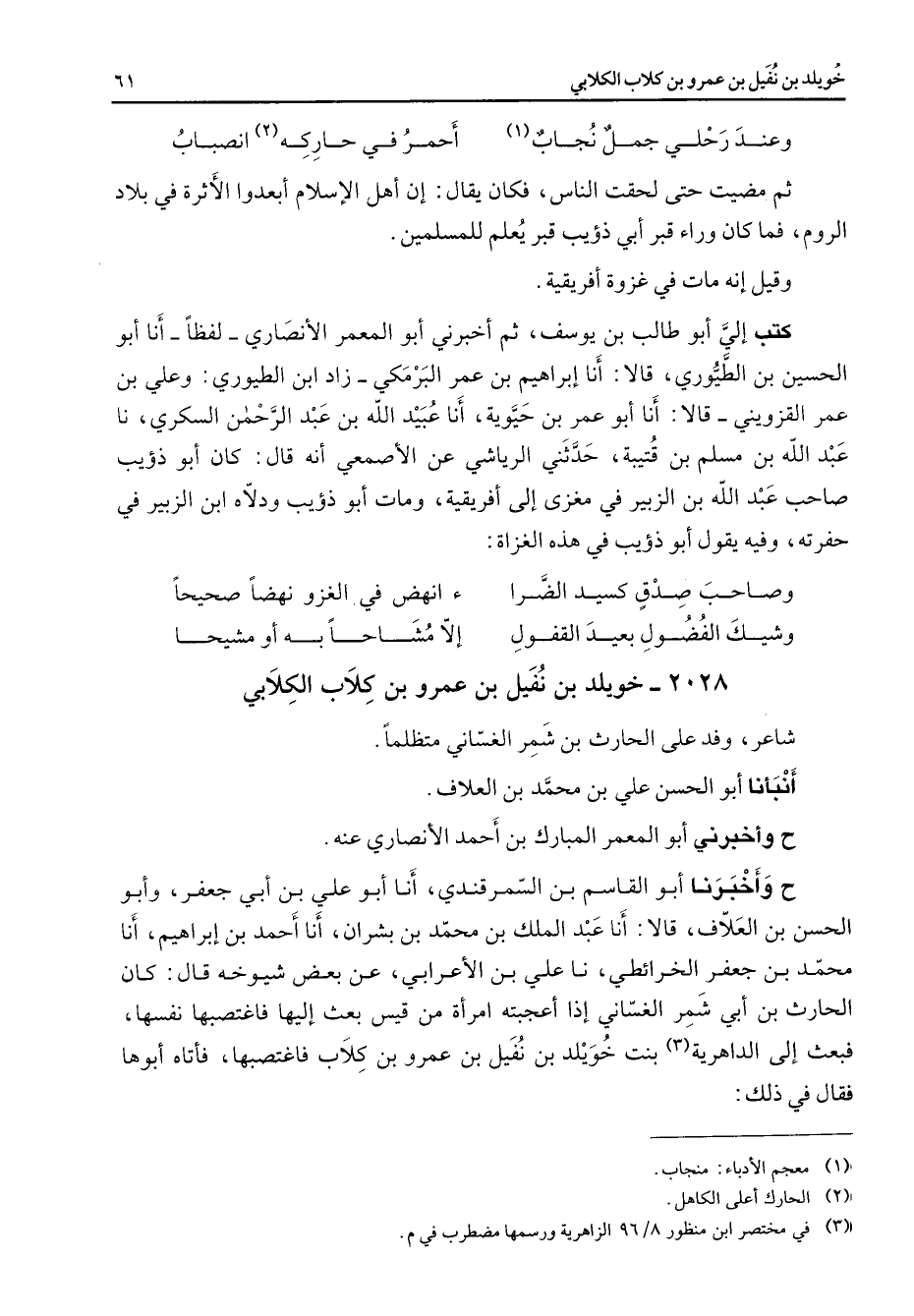 2028 - خويلد بن نفيل بن عمرو بن كلاب الكلابي شاعر وفد على الحارث بن شمر الغساني متظلما أنبأنا أبو الحسن علي بن محمد بن العلاف ح وأخبرني أبو المعمر المبارك بن أحمد الأنصاري عنه ح وأخبرنا أبو القاسم بن السمرقندي أنا أبو علي بن أبي جعفر وأبو الحسن بن العلاف قالا أنا عبد الملك بن محمد بن بشران أنا أحمد بن إبراهيم أنا محمد بن جعفر الخرائطي نا علي بن الأعرابي عن بعض شيوخه قال كان الحارث بن أبي شمر الغساني إذا أعجبته امرأة من قيس بعث إليها فاغتصبها نفسها فبعث إلى الداهرية بنت خويلد بن نفيل بن عمرو بن كلاب فاغتصبها فأتاه أبوها فقال في ذلك
